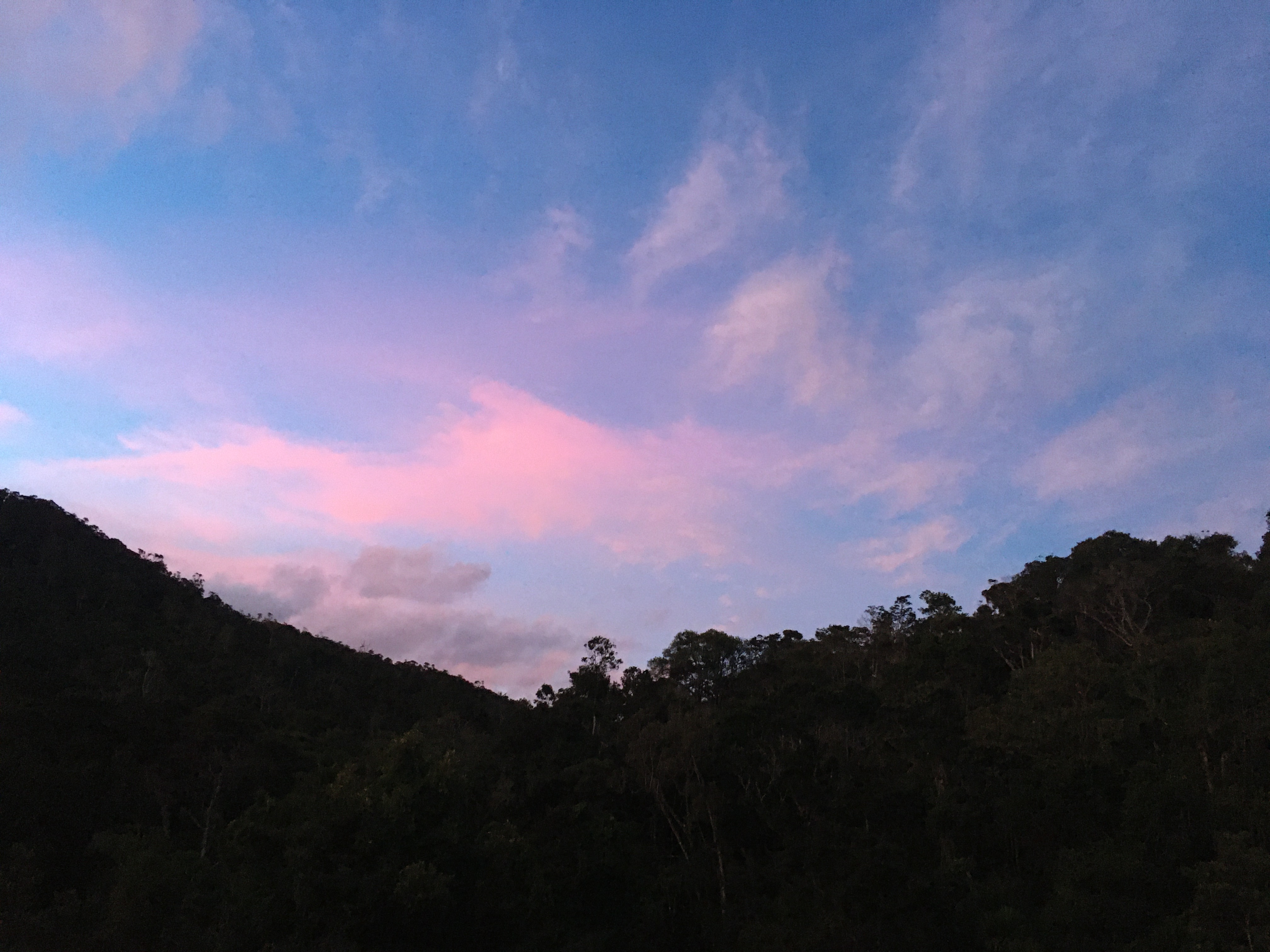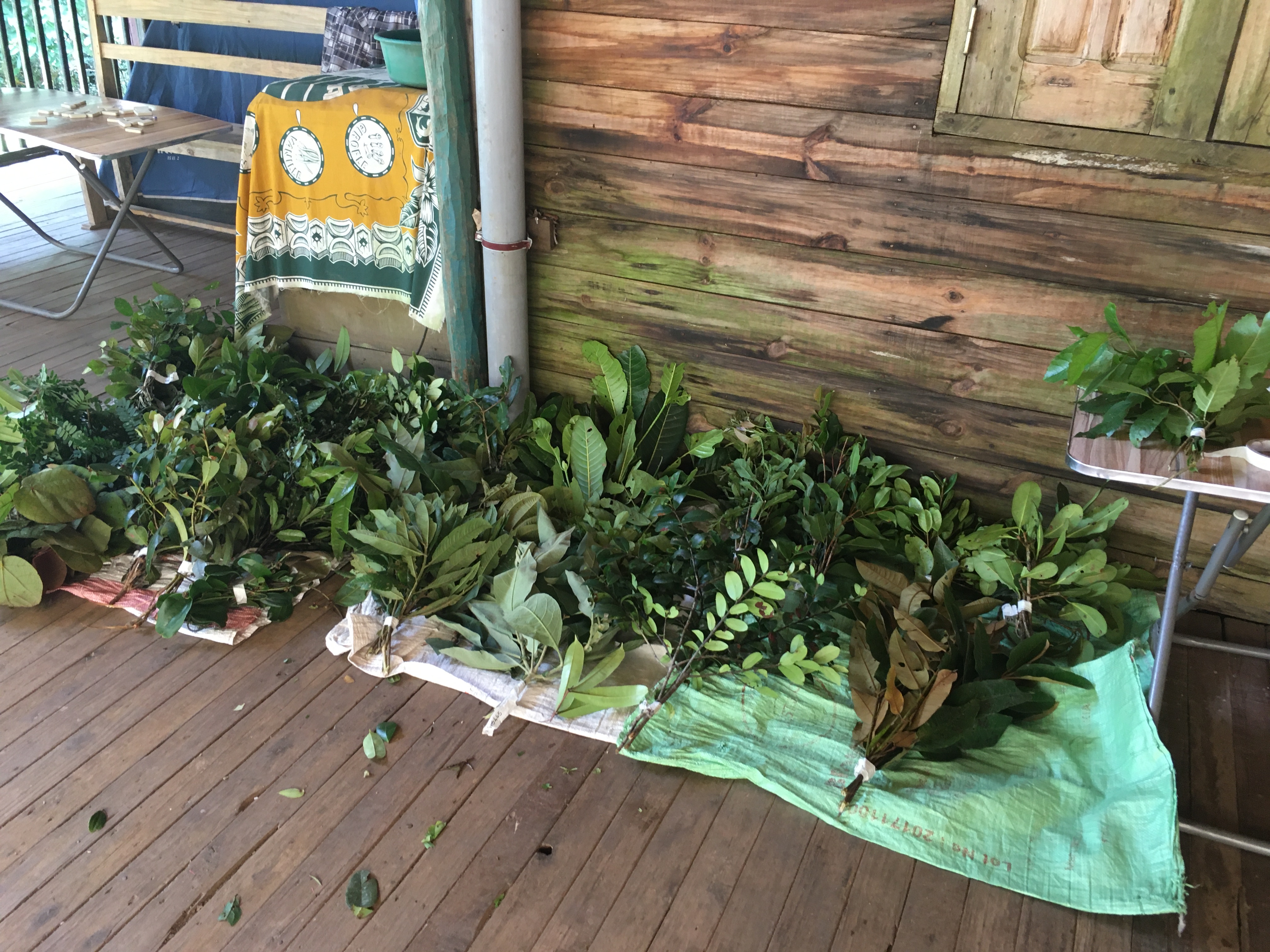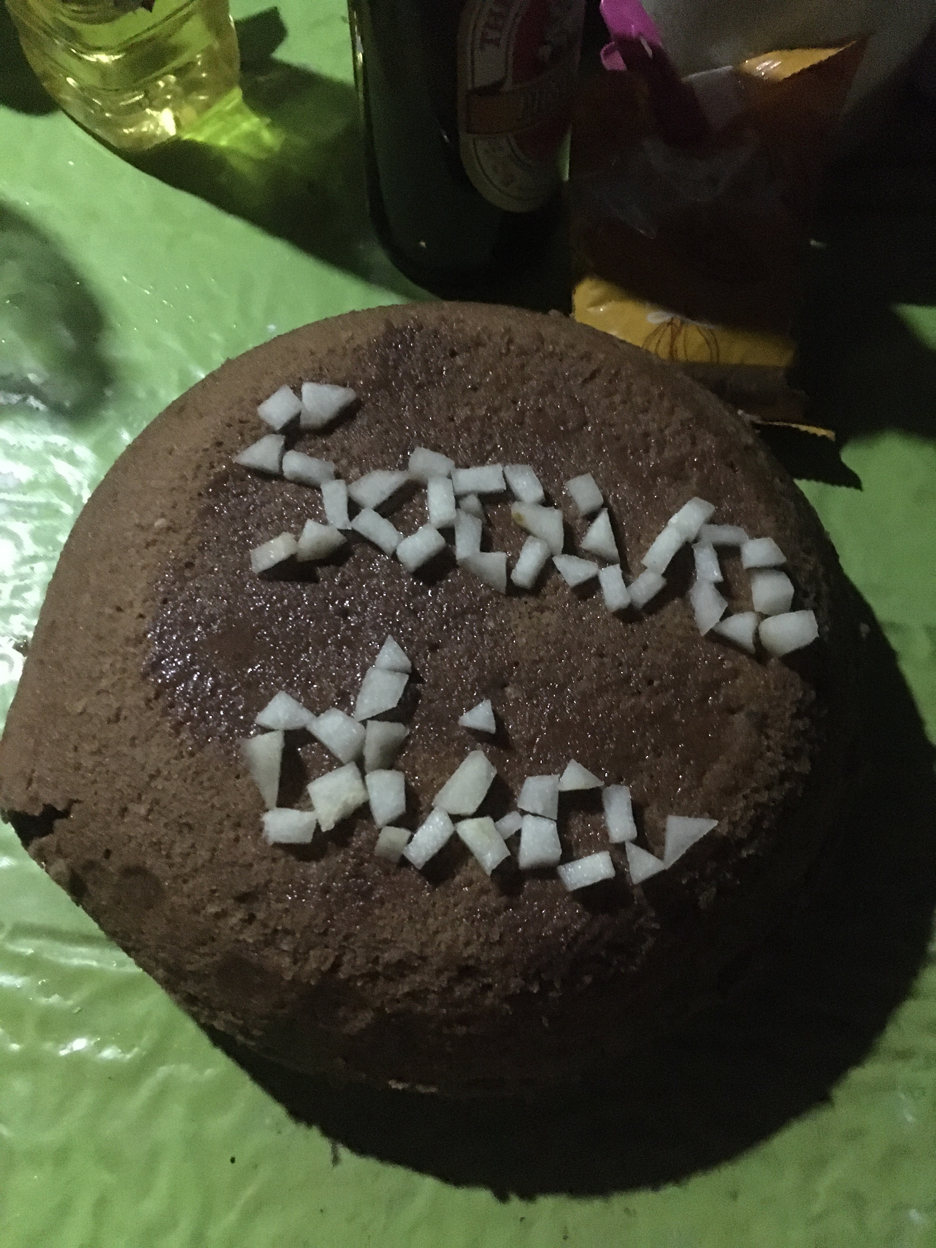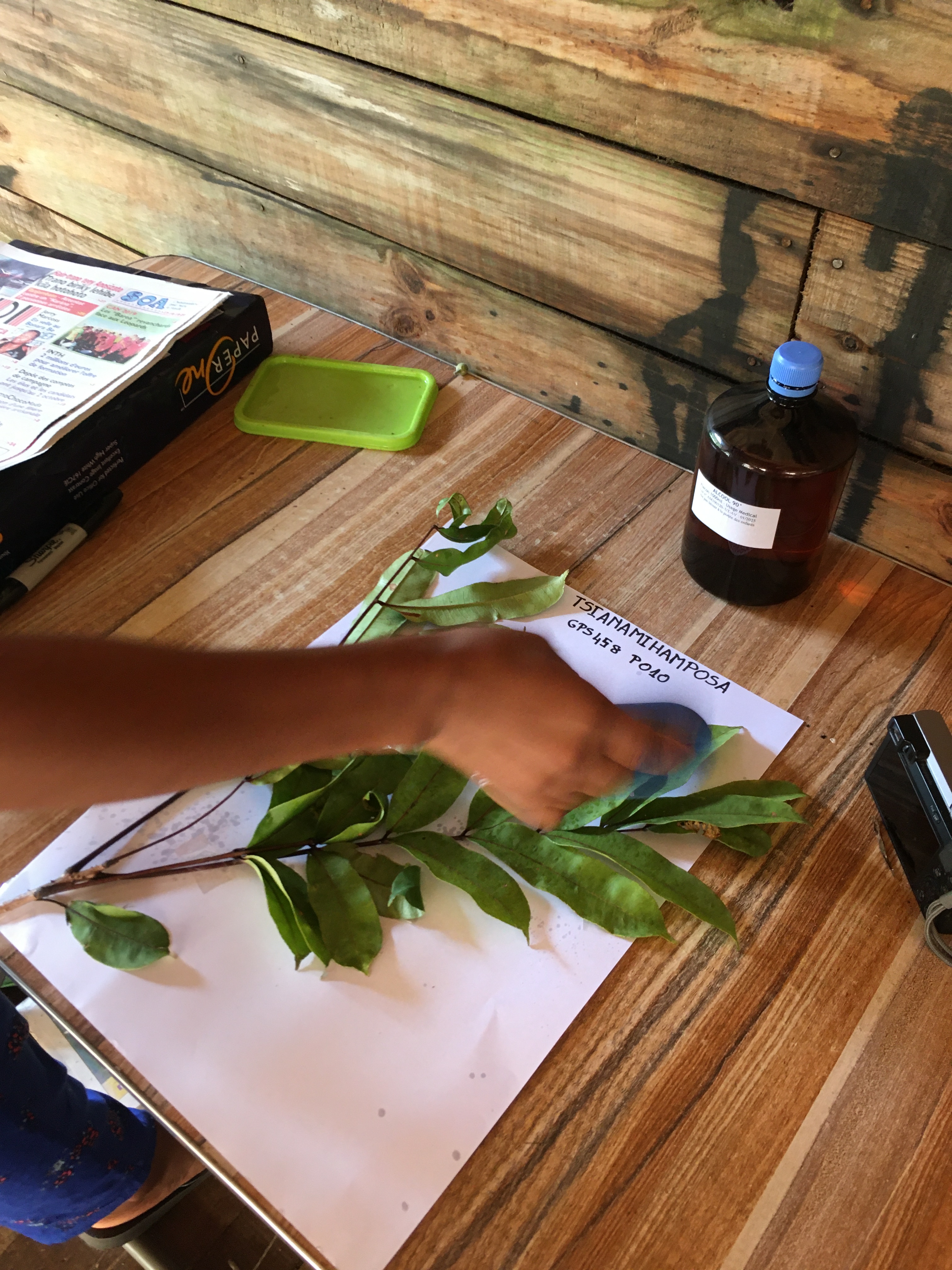 While our early experiences in cyclone season were seemingly no big deal, as the season dragged on, we continued to get bombarded with rain. Cloudy mists/downpours over the forest [Center left] became the norm as we searched on the ridges for our animals each morning. Previous trails became flooded rivers [Center right]. Even though it was rainy, the forest was still buzzing with activity, including the lemur-imitating blue couas [Coua caerulea; Center left], croaking frogs [Lower right], and streaked tenrec babies [Hemicentetes semispinosus; video; Video credit: Herinjatovo Maminirina]. The brown lemur babies [Upper right] who had been just born six months ago got big enough to be mistaken for adults as they dash in and out of view in the canopy of the fruit trees. To pass the time during rainstorms, we also began creating herberium specimens of the different lemur foods [Upper left] for scientific identification. In typical field style, we had to improvise a little on the preparation, resorting to spreading the rubbing alcohol on the samples (for preservation) with a laundry brush [Upper middle]. For a blissful weekend, the clouds parted, revealing beautiful pink and orange sunsets viewable from the hill above our camp [Center right]. Unfortunately, March also brought the news that COVID-19 was getting worse worldwide, and we needed to evacuate. At our “goodbye for now” party, my team [Lower left] surprised me with the chocolate cake [Lower right] that I had been craving, decorated with pear slices spelling Soava dia [Malagasy: Safe travels]. While I miss them and our forest life, I’m looking forward to the day we can return to uncover the mysteries of lemur social behavior and witness the seasonal changes in the forest.