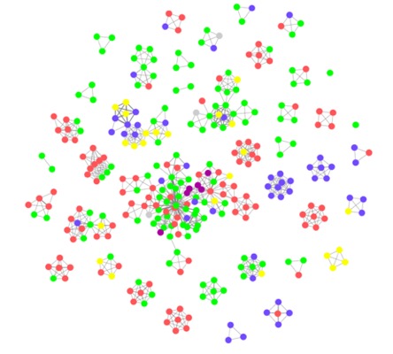 The colored dots, or nodes, represent each individual author and the color variation delineates author fields of expertise (right). The lines connecting the authors, called edges, represent co-authorship on a given paper.