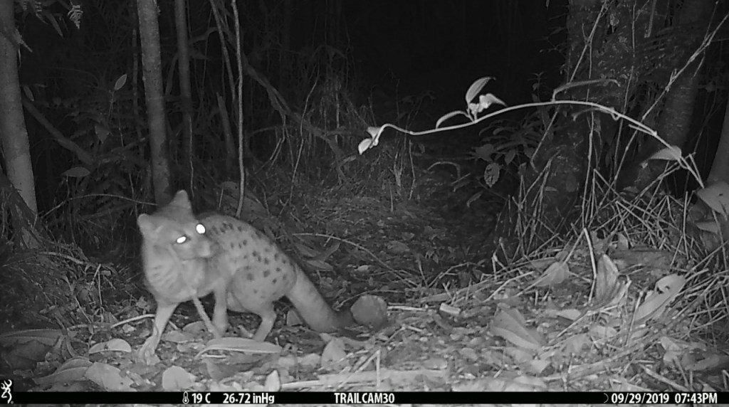 The Malagasy civet (Fossa fossana) is a small terrestrial carnivore from Madagascar’s rain forests. Contrary to their name, they are not closely related to civets, but rather a part of the endemic family Eupleridae. They have a diverse diet including crabs, frogs, snakes, millipedes, rodents, and tenrecs. This photo was captured using camera-traps, a type of camera that automatically takes images or video anytime an animal passes in front of it.