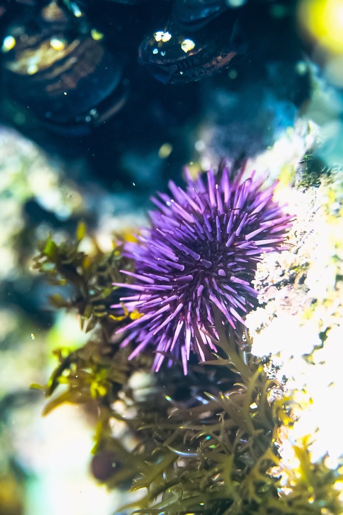 Sea urchins, including this purple sea urchin (Strongylocentrotus purpuratus) will use their tiny tube feet to grab and cover themselves in pieces of algae, small rocks or shells. It is thought that this behavior protects urchins from drying out in tidepools, getting eaten by seagulls, or being damaged by the sun’s ultraviolet rays.