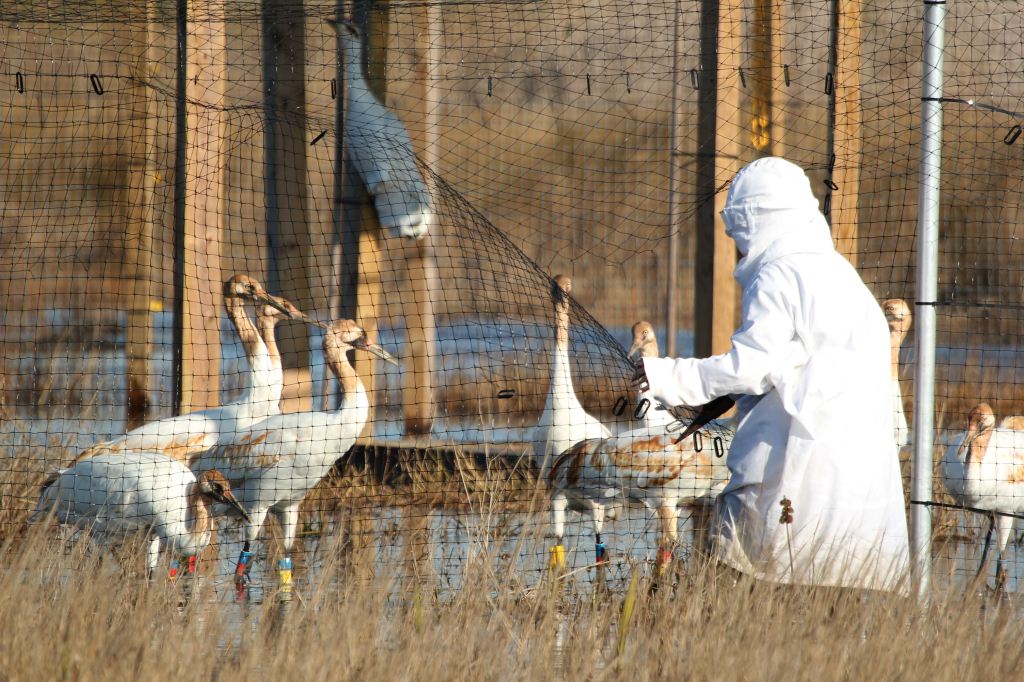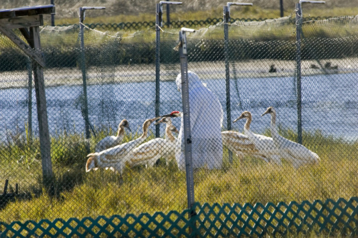 In order to conserve the whooping cranes, scientists have used both in situ (on-site in the wild) and ex situ (captive) efforts. In 1984, an early in situ program began removing eggs from whooping crane nests that were not likely to develop properly. The eggs were replaced with fertilized eggs from other nests to increase hatching success. While whooping cranes normally lay two eggs, one hatchling often dies from siblicide (the younger sibling usually killed by the older) or predation. Thus, spreading out the fertilized eggs among nests may lead to increased chick success. During the study period, many pairs were successful at rearing single eggs, and overall hatching success increased. Some eggs were also removed to establish captive breeding populations [2, 4, 5] in ex situ conservation programs. The goal of many ex situ conservation programs is to breed animals in captivity to release into the wild. Those released animals must be raised by someone, and without captive whooping cranes, scientists turned to the more common sandhill crane (Grus canadensis) [6]. The sandhill cranes fostered the whooping crane offspring in captivity, but the offspring struggled to thrive when they were released to the wild. The whooping cranes may have sexually imprinted on their sandhill crane foster parents (meaning that they learned to desire characteristics from the other species), making it difficult for them to pair up with other whooping cranes to breed [2]. Infertility, low egg counts, and delayed onset of egg laying have also inhibited captive programs. Additionally, migration routes need to be taught to the captive-bred whooping cranes. Chassahowitzka National Wildlife Refuge in Florida and Necedah National Wildlife Refuge in Wisconsin host a non-natural migratory population that was trained to fly south for the winter for their very first migration by a human-piloted ultralight aircraft. Once birds have been trained, they are able to successfully complete future migrations and reduce deviation from their path more and more effectively as they gain years of experience [7, 8].