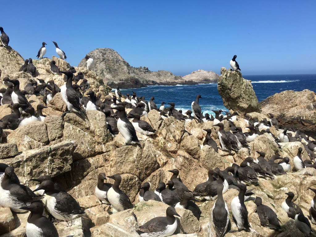 Common Murres (Uria aalge) live in some close quarters! These tightly packed colonies, called “loomeries,” allow for Common Murres to practice allopreening (grooming one another). In addition to reducing parasite loads, allopreening may also play an important social role. Mates groom mates and neighbors groom neighbors!