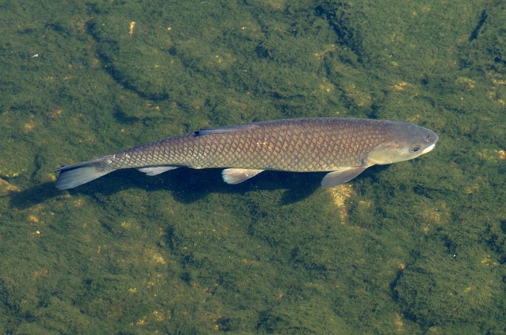 Known to many landowners as a lawnmower for aquatic plants, Ctenopharyngodon idella, or grass carp, can eat up to 100% of their body weight in aquatic vegetation every day [1]. Their passion for eating plants makes these fish useful to humans, and they are often placed in ponds and lakes to keep the water clear of weeds. Grass carp are native to Eastern Asia, but they have been introduced to waterways around the world by humans.
