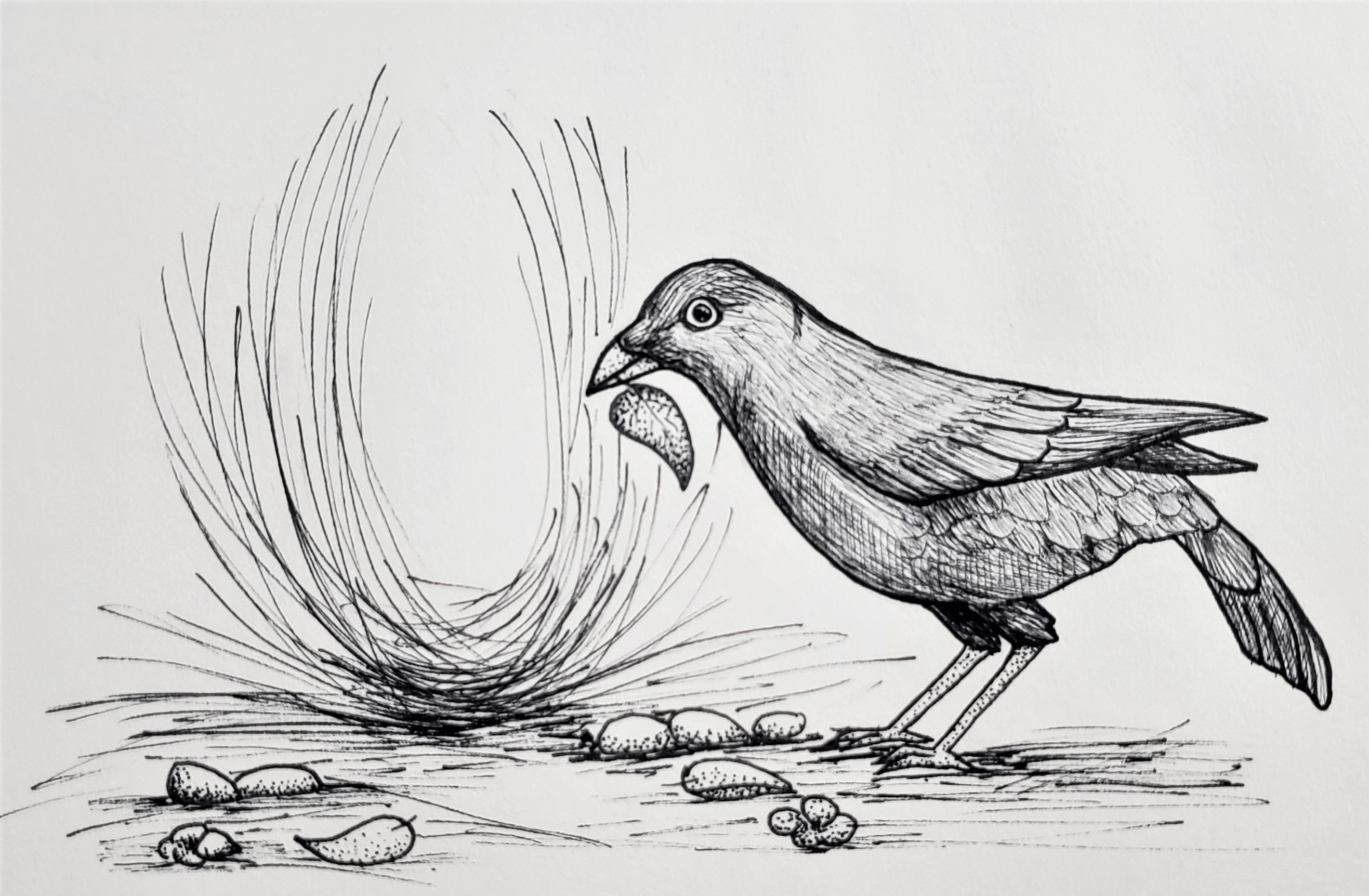 Many birds rely on their physical attractiveness to find mates. Although by no means schlubby, male bowerbirds also build elaborate “bowers” (architectural displays made with twigs and many other items) to court their potential mates. Shown in today’s sketch is an avenue bower, a particular type of bower with two vertical walls and a broad base. Often times one of the avenue openings is decorated with extra items to create an additional display. Bowerbirds will even use manmade objects for decoration, and they are notorious for stealing coins, bottle caps, and pieces of glass, among other items, for their display.