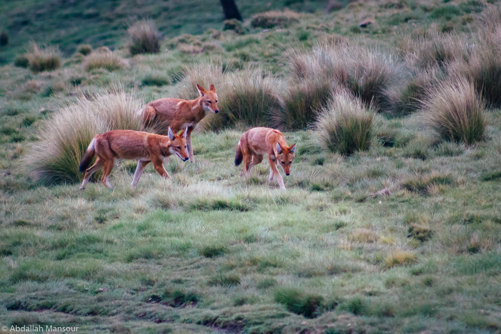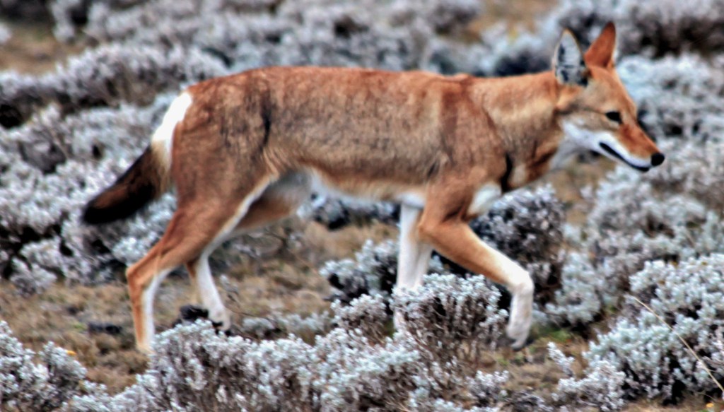They say foxes are sly and elusive creatures, but even more elusive is the Ethiopian wolf (Canis simensis), commonly referred to as the Simien fox. Despite its foxy nickname, bushy tail, and reddish fur, the Ethiopian wolf is actually a true wolf. This means that it is more closely related to the Eurasian grey wolf (Canis lupus) and coyote (Canis latrans) than to any of its canine neighbors in Africa [1]. Unfortunately, despite being an accomplished predator, its elusive nature is due to more than just the stealth of a hunter. The Ethiopian wolf is an endangered species with less than 500 adults remaining in the wild [2], making it the rarest canid in the world [3].