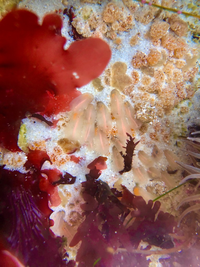 Light bulb tunicates (Clavelina huntsmani), named for their bands of pink internal organs that resemble light bulb filaments, are a social species of tunicate (or more adorably known as “sea squirts”) that reproduce asexually so what you see here are red algae surrounding a little cluster or sea squirt clones! Spoooooky!