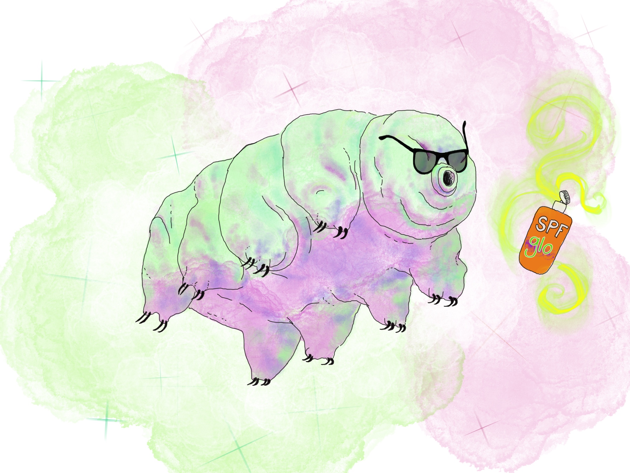 Tardigrades are true survivors known to be able to withstand extreme cold, heat, pressure, and radiation. Recently, it has been discovered that the biofluorescence of certain tardigrade species may be behind their ability to withstand intense Ultra-Violet radiation. Biofluorescence, as opposed to bioluminescence (which refers to chemical reactions like the light of a firefly), refers to the absorption of UV light by molecular pigments in an animal that then emit a lower energy light that is visible to the human eye and therefore produces a glowing effect. Functionally, it appears that this process also helps defend these little creatures from the damaging effects of UV exposure, acting almost like a colorful sunscreen!