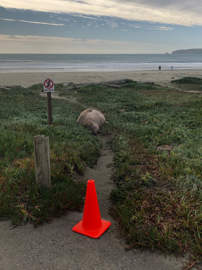 Pinnipeds (i.e. seals, sea lions, and walruses) are considered amphibious marine mammals, meaning they spend significant parts of their life on land. For example, this elephant seal (Mirounga angustirostris), hauled out on a popular beach in Point Reyes National Seashore during mating season (which has begun on the coast of California). These animals spend a lot of energy defending territories, mating, and all without eating or drinking for several months (for more info and mating season drama, check out this Creature Feature). For the safety of yourself and respect for wildlife we share the shores with, we all need to keep our distance. A good (and quite literal) “rule of thumb” to know if you’re too close to a seal is to give a Thumbs up in front of the animal, & if you can see any part of the seal, you are too close. Take a few steps back & if you love watching wildlife, invest in a good pair of binoculars so you don’t miss the action.