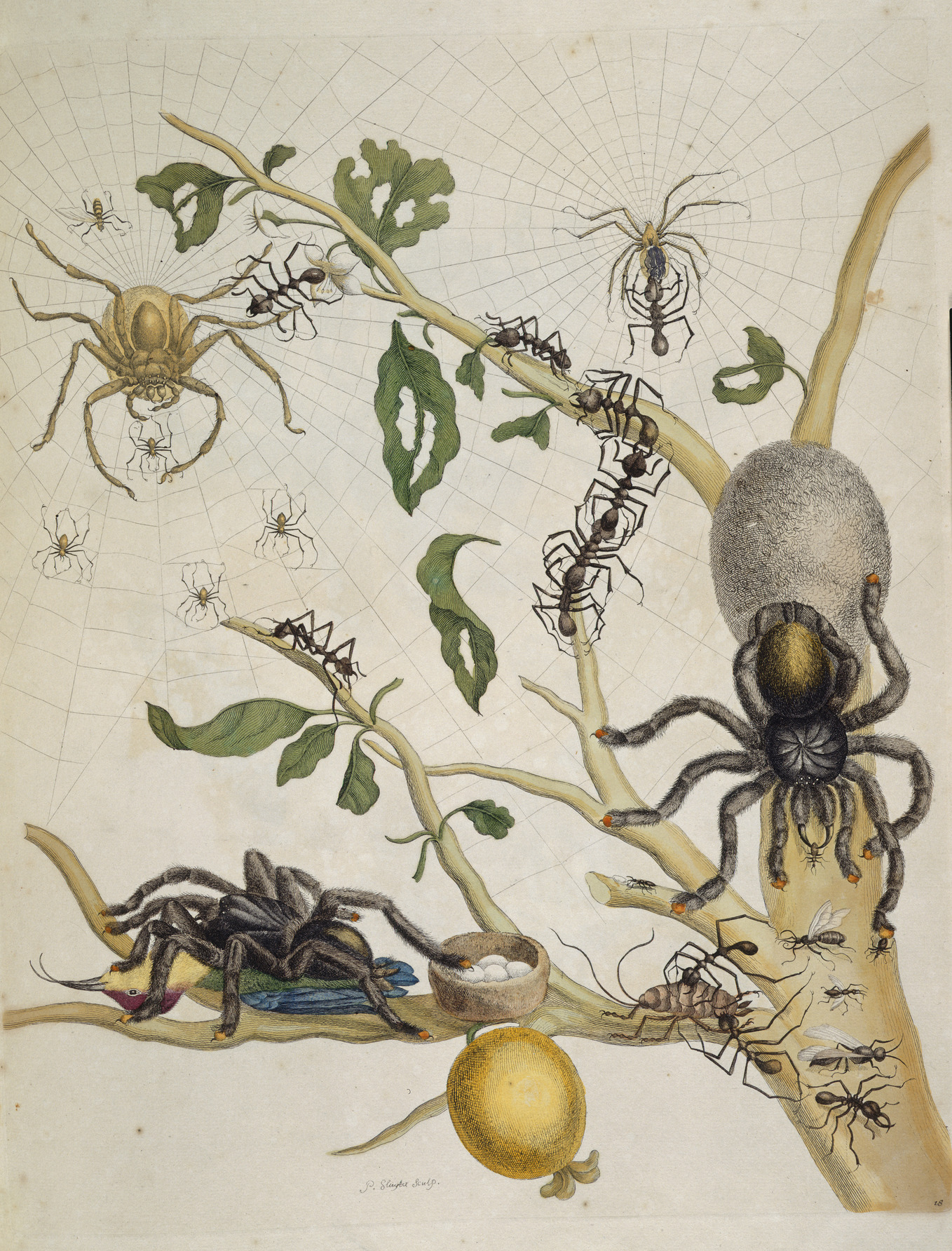 Upon her return, with numerous paintings and specimens, Merian began working on her second book, which would highlight the wide variety of exotic entomological life cycles she observed and depicted in Suriname. The book was published in 1705 under the latin title โMetamorphosis insectorum Surinamensiumโ (The Metamorphoses of the Insects of Suriname) [2]. The illustrations and descriptions of development, insect-plant relationships, and insect-animal relationships were not only beautiful pieces of artwork, but scientifically accurate; they detailed the wonderous, natural imperfections of wilted blossoms or torn plant leaves and coupled the flora and fauna into one ecological illustration. Some pieces were shocking, and their accuracy questioned, especially since such things were never seen before and such scenes were deemed by some as grotesque for a woman to depict. One such famous piece (see below) was of a tarantula feeding on a hummingbird [2]. Regardless of some naysayers, Maria Sibylla Merianโs second and final publication attained much success and was regarded very highly amongst her contemporaries as well as future artists, scientists, and naturalists. Some of the original plates depicting her artwork from this publication are on display at the National Museum of Women in the Arts in Washington, D.C. Merian spent the remainder of her life selling her artwork and books (including prominent individuals such as the Russian Tsar, Peter the Great) until her death in 1717. Following her death, during the Victorian Era, Merianโs work fell under scrutiny as women were suppressed to more strictly adhere to the housewife role expected of them. Her work, forgotten for hundreds of years, has recently resurfaced and is celebrated for the pivotal contributions to the artistic and scientific communities.