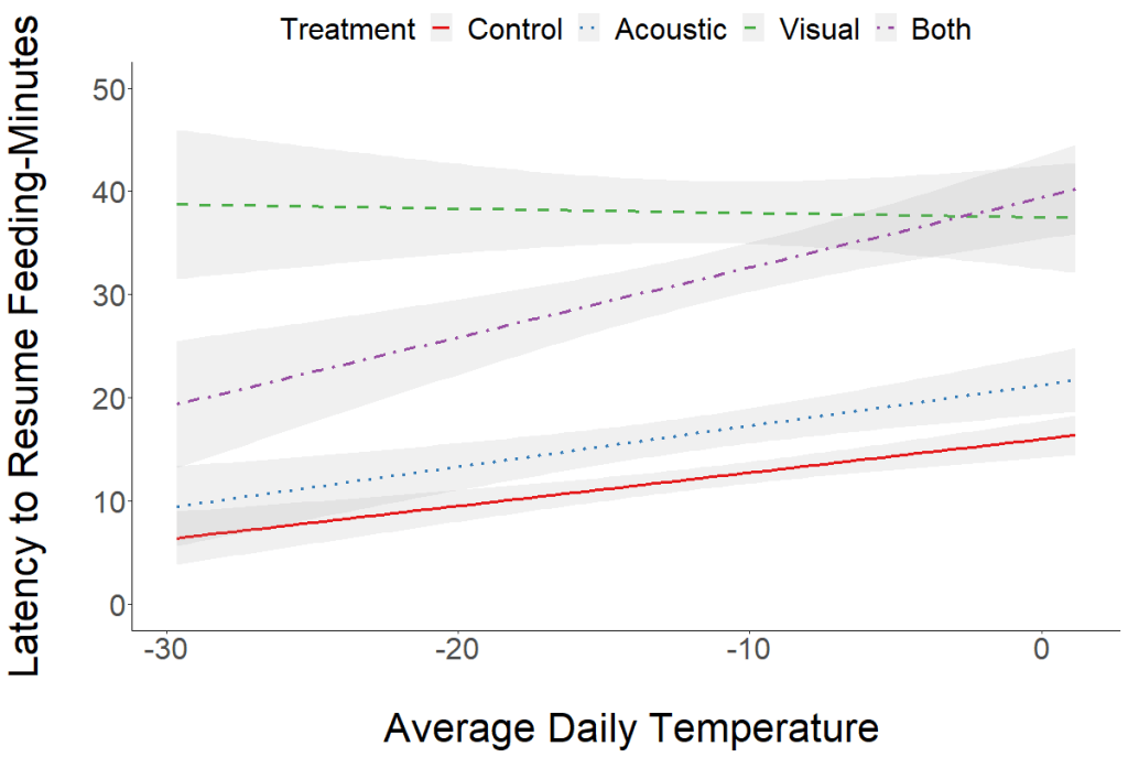 The researchers predicted that seeing the predator (visual cue) would be the most reliable source of information and would produce a greater response in their behaviour, so the birds would take longer to return to the feeders after they were presented with the fake predator. There was a notable variation in the response from the birds, but effectively this predication turned out to be accurate. Chickadees took on average 52.6 minutes to return to the feeders after seeing the predator and only 37 minutes after just hearing alarm calls. The researchers also found that when the visual and acoustic cues were presented together, the response was the same as when only the visual cue was presented, meaning that there was a redundant response and no additional information to affect the response when given acoustic cues. This response, however, was not always the same and changed depending on the temperature of the day. On harsher winter days, this redundant effect disappeared, and chickadees responded more to a visual cue alone than the combination of cues.