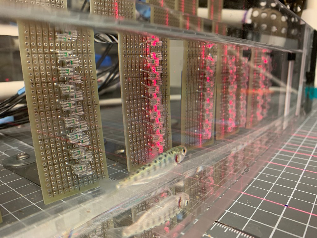 Another key threat to salmon is predation. There are many different predator species in the Sacramento-San Joaquin River Delta, an expansive inland river and estuary system that is home to millions of salmon in California each year. Now, if we consider that different organisms possess different optimal temperatures, it is almost certain that predators and salmon will not respond in the same way to the same temperature changes. For instance, we could expect salmon to perform better (I’ll go into what this means below) at cooler temperatures, but perhaps a key predator species would perform better at warmer temperatures. This might lead to the outcome that has been previously reported: salmon have decreased survivorship at warmer temperatures. These were the hypotheses and predictions that led me to my first experiment, starting in the spring of 2019.