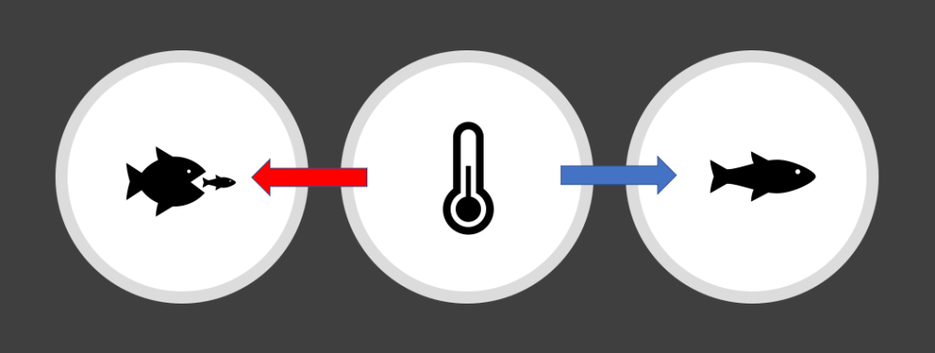 As I’ve come to learn through my current research, temperature is one of life’s master variables. It affects where organisms can go, what cues they use to feed, how fast they can move, how well their bodies function, whether they can survive, and in some cases (such as sea turtles [1]), even what sex they are. In fact, we can divide most organisms into two broad categories based on how they control their body temperature. Many animals, such as mammals (including humans) and birds, are endotherms. This means that we can maintain our body temperature regardless of what is going on around us. You may have also heard of endotherms referred to as “warm-blooded” animals. Being an endotherm is like having a cool superpower – barring any other obstacles, you can undertake your daily activities across a very wide range of temperatures. Alternatively, ectotherms (often referred to as “cold-blooded” organisms) rely heavily on their environment to control their body temperature and have to behave accordingly. This is why you may observe lizards basking on a rock, for instance; the heat from the sun is an excellent way to increase their body temperature [2]. Reptiles and most fish are ectothermic, occupying habitats that have the most appropriate temperature for their bodily functions. It is important to note here that this optimal temperature will depend on the species; some fishes operate better at warmer temperatures than cooler temperatures, for example. In the context of climate change, all of this information suggests that certain organisms, particularly ectotherms, will have more difficulty adapting to global warming than others. How that vulnerability will manifest is something I have spent the last year exploring.