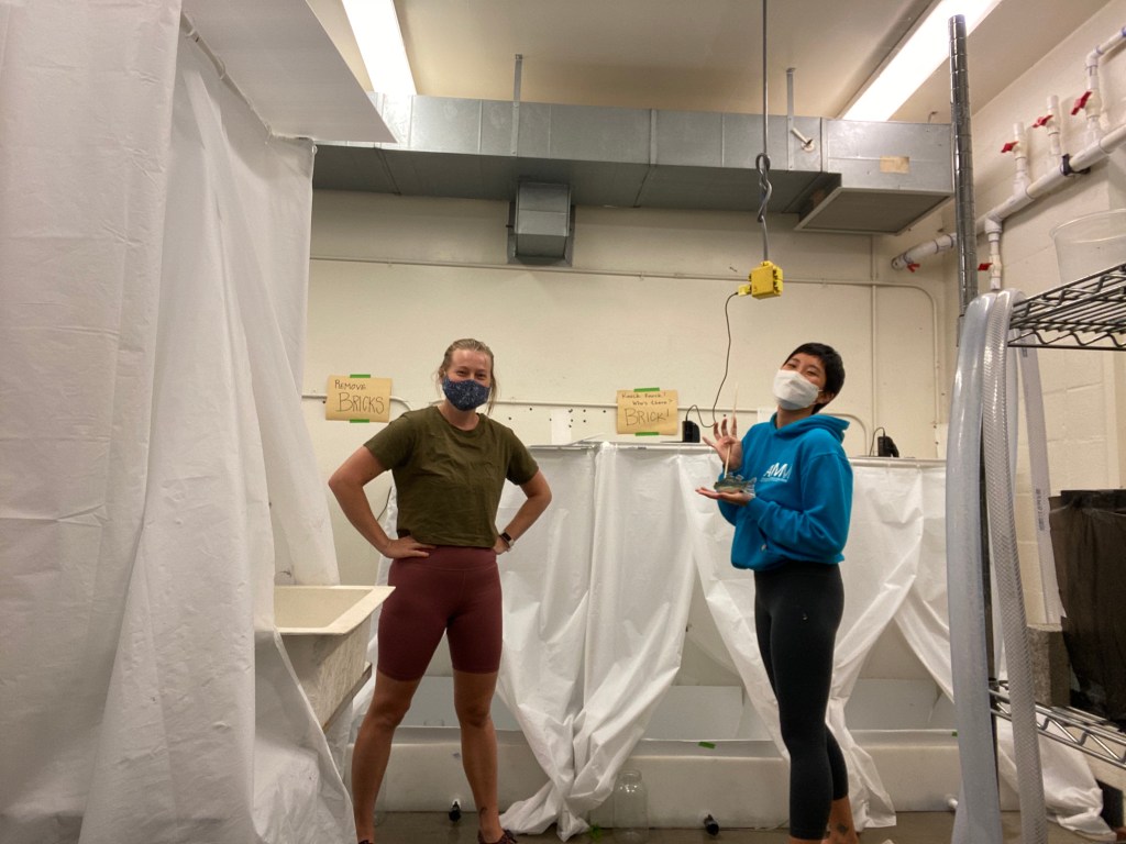 Coronavirus has changed the “face” of research for many graduate students. Keep those masks on. Graduate students Amelia Munson and HeeJin Chung socially distance in the lab while working on a project designed to understand how recent experiences shape anti-predator behavior in fish.