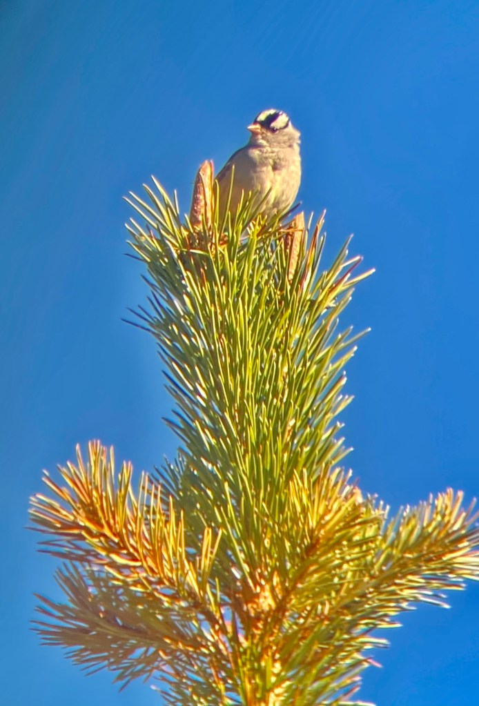 A male white-crowned sparrow (Zonotrichia leucophrys) on his song perch. It is important for my research to try to record a sample from every male’s song throughout the season.