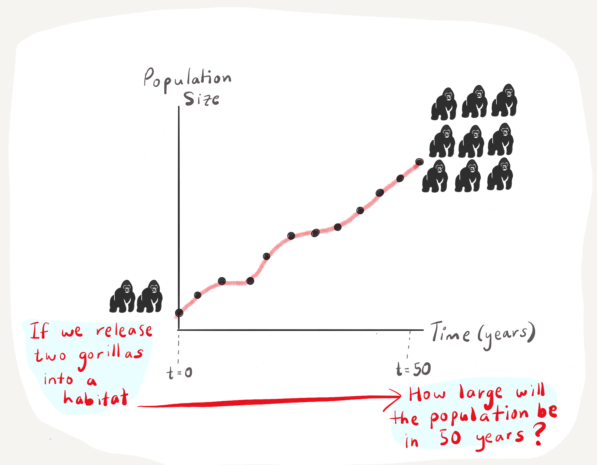 I didn’t end up getting a visa that summer, and I did not collect any data that season. However, an unexpected research project landed in my hands. My advisor had put me in touch with collaborators at a primate sanctuary in DRC. They needed someone to work on a computer simulation for a wildlife reintroduction program. In conservation science, reintroductions involve releasing animals—often ones raised in sanctuaries or zoos—back into their natural habitats. For animals like gorillas, this is complicated by several factors. Great apes are long-lived, have lengthy gestation and nursing periods, and live in family groups with complex social dynamics. Before releasing a group of gorillas willy nilly into the forest, it’s important to estimate the success rates for different scenarios. Reintroduction success can be measured in different ways. Our goal was to determine how many released gorillas would ensure a 0% chance of extinction over 50 years, while considering random events that affect demographic processes such as birth and death. This sort of analysis is called a population viability analysis (PVA) and is increasingly recognized as an important tool for wildlife reintroduction programs. Since I suddenly had some free time on my hands, my advisor figured I could be put to work.