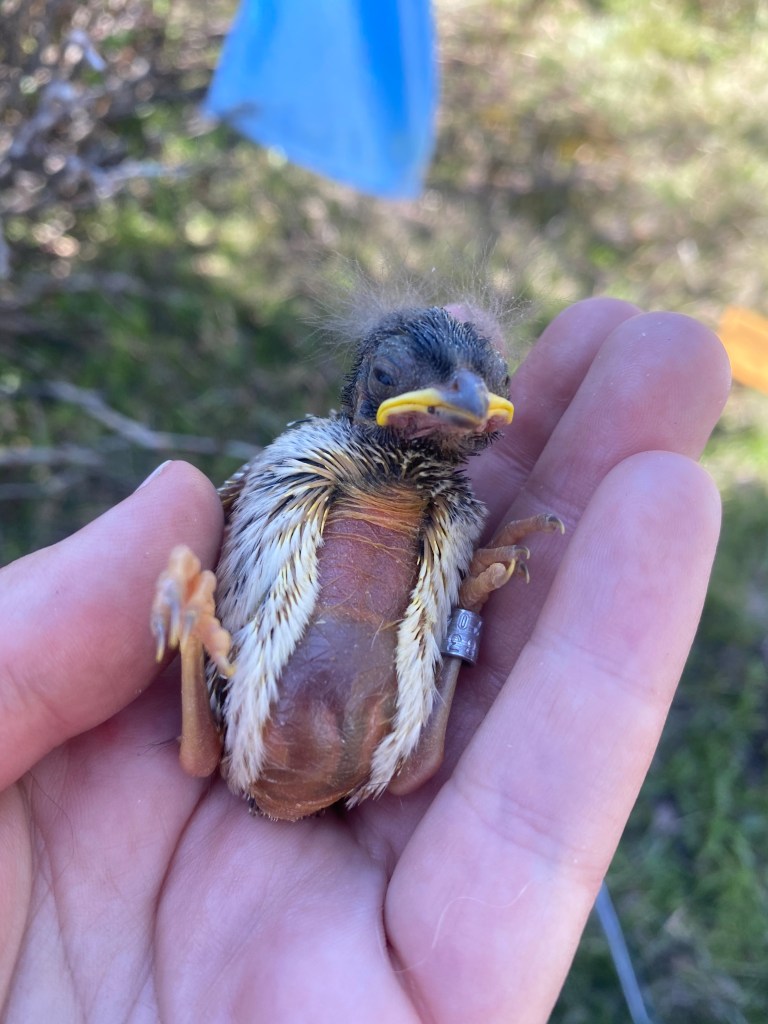 At 6-days old I take measurements of nestling White-crowned sparrows (Zonotrichia leucophrys). Each nestling is affixed with a small metal band around its leg, this band has a unique ID number so if it is ever caught anywhere in the world, we’ll know exactly where it is from.