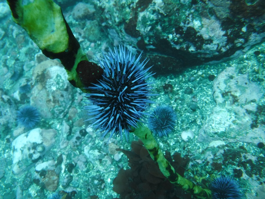 Kelp-craving purple urchins (Strongylocentrotus purpuratus) are contributing to an underwater housing crisis! Kelp are considered ecosystem engineers because they provide food and shelter for many marine species. Due to several disturbances in the kelp forest, this underwater ecosystem in Northern California has been thrown off balance. Without predators to keep purple urchin populations in check (to learn more about urchin predators check out this Creature Feature), these “goats of the sea” are mowing down kelp (seen here, Nereocystis lueketana) in mass quantities, creating urchin barrens.