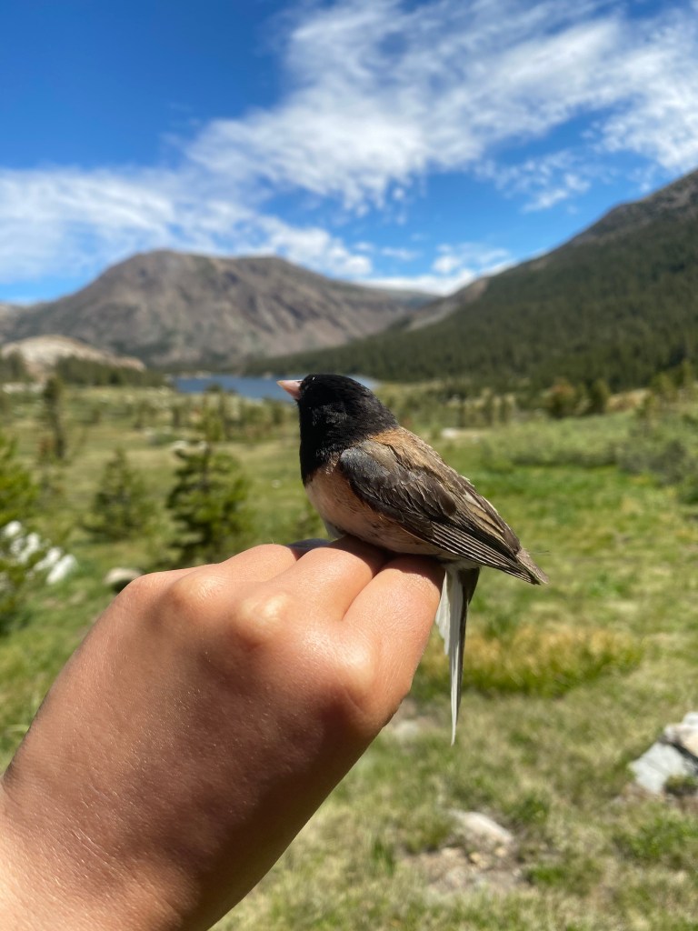 Even though my study species is White-crowned sparrows (Zonotrichia leucophrys), we sometimes catch other hungry birds by accident. This is a dark-eyed junco (Junco hyemalis) that wandered into our research traps for a quick birdseed snack. They’re fun to see and we let them go on their way as soon as they are satisfied with their free snack!
