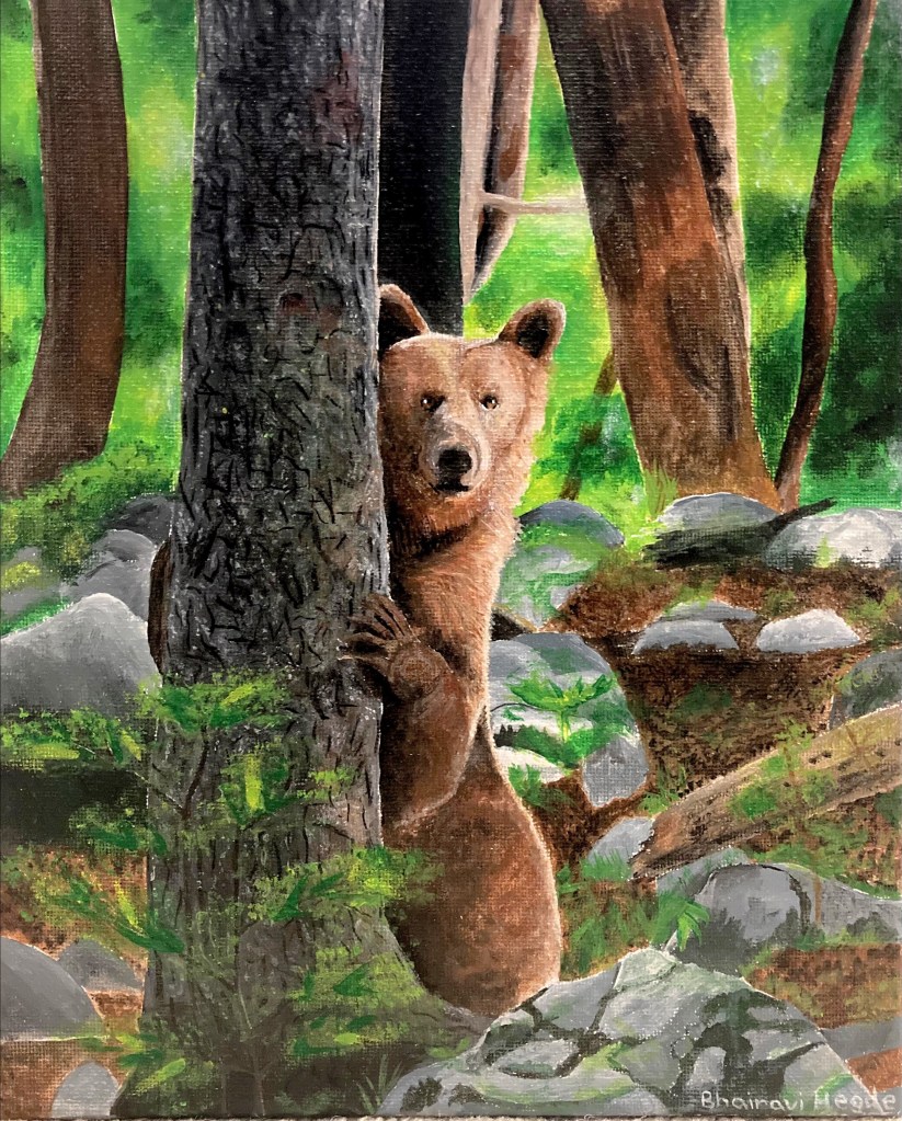 A timid brown bear (Ursus arctos) peeks out from behind a tree in its lush pine forest home. Brown bears all over the world were once threatened because they were considered a threat and were killed by trophy hunters. Habitat loss and deforestation mainly caused by the logging industry further harmed these creatures. Because of tireless efforts from many biologists and conservationists, today, approximately 200,000 brown bears remain in the world, with numbers in the US slowly repopulating.