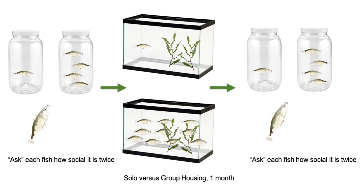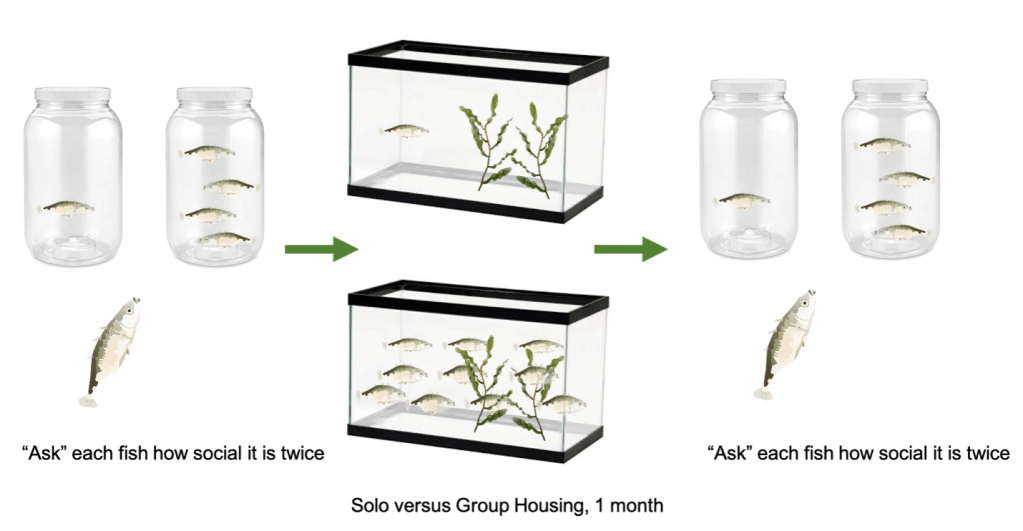 While this is a compelling theory, it has been poorly tested. Researchers at the University of California, Davis tested this theory using three-spined stickleback—a common freshwater fish. They first collected wild fish and brought them into the lab. There, they wanted to “ask” the fish how social they were. To do this individual fish were put in a large tank with two jars–one with 2 fish in it and one with 10 fish. They then measured how much time the fish spent close by each jar. Fish that spent more time next to the jar with 10 fish were counted as more social. Each fish was measured twice. Then fish were housed in one of two treatments—some of the fish were housed alone and the other fish were kept in groups of 10. After one month, all fish were measured for sociality twice more. This allowed the researchers to look at changes in social behavior and changes in how consistent an individual was before and after the housing treatment.