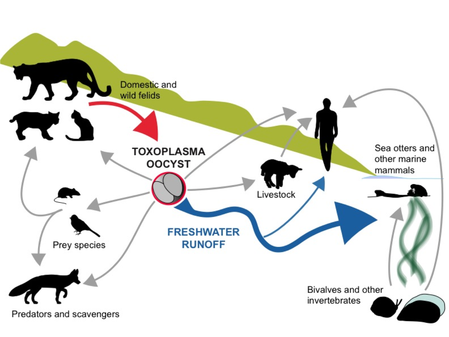 Animals that historically have not had exposure to T. gondii often have severe symptoms after infection, including death. The relationship between T. gondii infection and deaths in the endangered Southern sea otter (Enhydra lutris nereis) is well studied and hits close to home here in Northern California [3]–[5]. Since T. gondii is a terrestrial parasite and cats are not known for their swimming ability (otherwise we might have the “kitty paddle”), you might wonder how parasites in cat poop end up in the ocean. Parasite transport can occur due to a process called surface runoff, where rainfall washes away the top layers of soil and pulls it to lower elevations until this polluted water reaches the ocean.