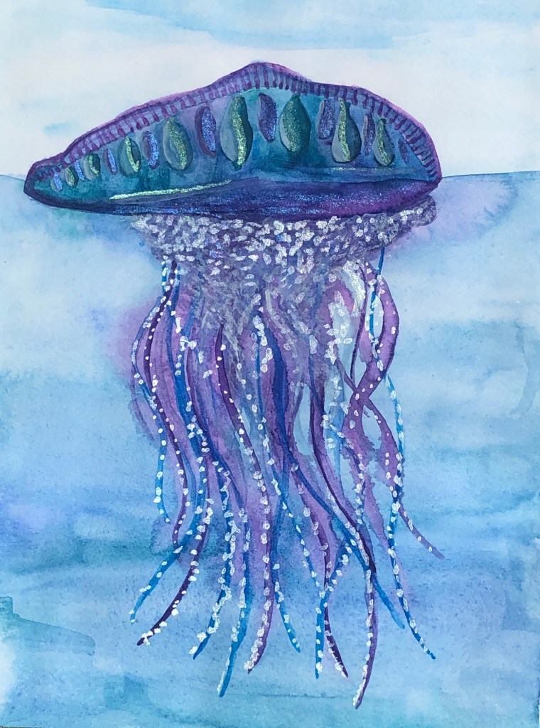 Did you know: Portuguese man-of-war (Physalia physalis) are not a type of jellyfish? They are a siphonophore, which is an animal made up of a colony of organisms working together. The man-of-war is made up of 4 polyps/organisms (think corals or sea anenomes): 1) a gas-filled bladder with a little “sail” that sits on the ocean surface for movement, 2) the tentacles that can extend up to 165ft (about the width of a football field) with venom and muscles for killing prey and bringing it up to 3) gastrozooids, or the digestive organisms, and finally 4) some reproductive organs. Man-of-war venom is said to be as toxic as a cobras, and while that is effective for killing prey, it is not deadly to humans (but boy howdy does it hurt to get stung!!).