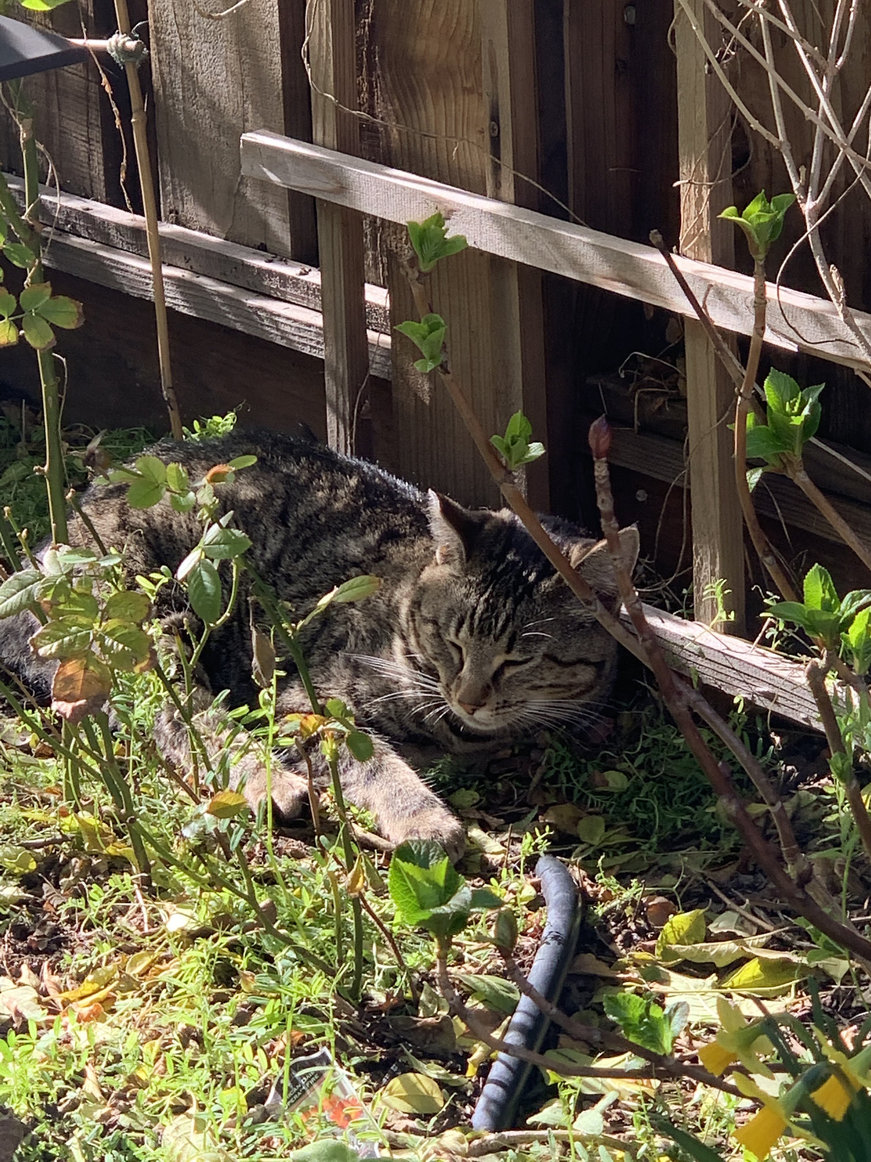 Besides living outdoors, how are feral cats different from housed cats? Although feral cats can be the same breeds as housed cats, their behaviors differ drastically. For example, Twinkle is an American shorthair, which is a popular cat breed to have as a pet. Even after being owned as an outdoor cat for half a year, she still dislikes being touched and frequently runs away when her owners get close. In contrast, if you were to adopt an indoor cat, they would get used to the environment at home. When cats feel threatened by humans, they hiss, widen their eyes, and shrink their head into their body. In contrast, housed cats would be less aggressive and opt to run away to hide. Feral cats are also nocturnal, actively hunting or exploring all night and sleeping all afternoon. Luna and Twinkle love being in nature, napping in bushes and sunbathing in the afternoon sun.