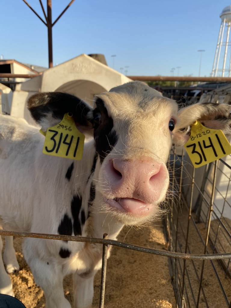 Did you know that dairy calves perform a wide variety of oral behaviors? In this photo, you can see the calf beginning to stick her tongue out, right before she performs a tongue flicking behavior. These behaviors have been previously associated with coping with stress and can indicate frustration! Current work in the dairy industry seeks to understand when and why these animals perform these behaviors.