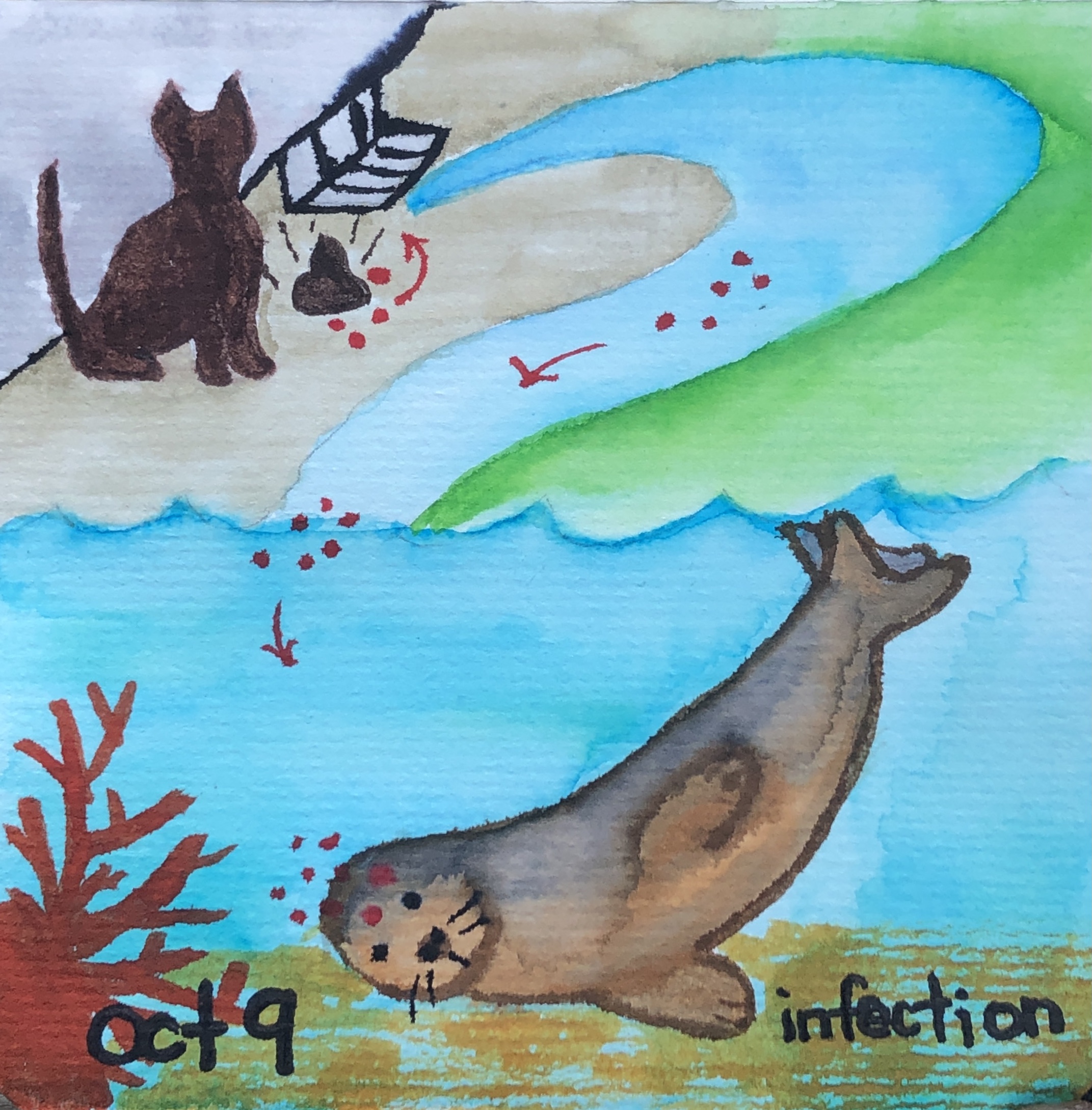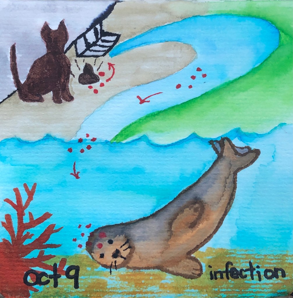 When cat poop gets spread through the environment and begins traveling through waterways, animals (including birds, humans, and marine mammals) may inadvertently consume the eggs and become infected. For marine mammals, such as the sea otter (Enhydra lutris) on the east Pacific coast and the Hawaiian monk seal (Neomonachus schauinslandi) in Hawaii, this is a huge problem! For Hawaiian monk seals, a critically endangered species, toxoplasmosis is lethal and is a slow, often painful death and has taken the lives of 12 seals, which is a large number when we consider there are only 300 of these animals in the main Hawaiian islands.