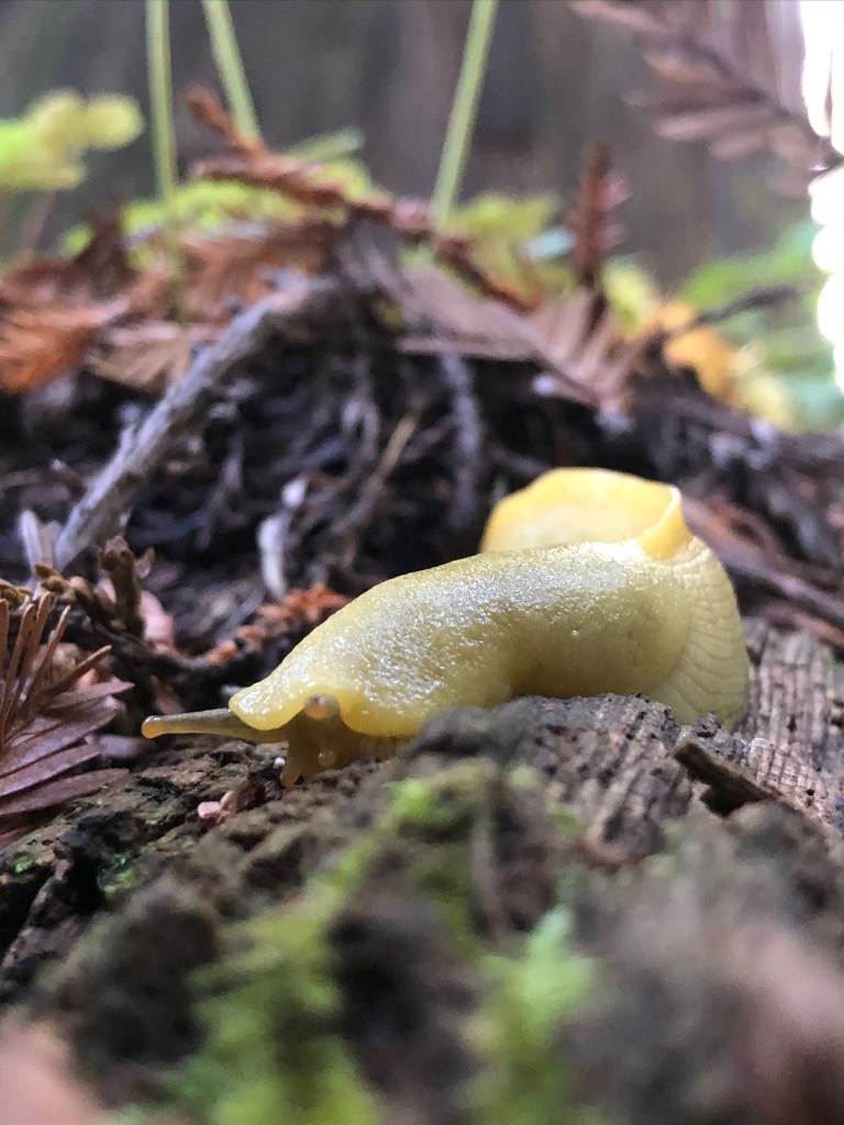If you are at all familiar with hiking in the woods of central and northern California, you may have come across an octopus’s terrestrial mollusk relative, the California banana slug (Ariolimax californicus)! Banana slugs have a mucousy membrane covering their body that is essential for breathing, mating, and deterring predators. This golden, slimy, charismatic invertebrate has a symbiotic friend with the much larger, charasmatic, quentiscentially California redwood tree! In exchange for a cool, moist habitat that banana slugs rely on to keep their membrane nice and slimy, banana slugs will eat the redwood’s plant competitors and forest floor detritous so that their own seedlings can grow! In fact, banana slugs prefer to eat cardboard over redwood tree seedlings- talk about friendship!