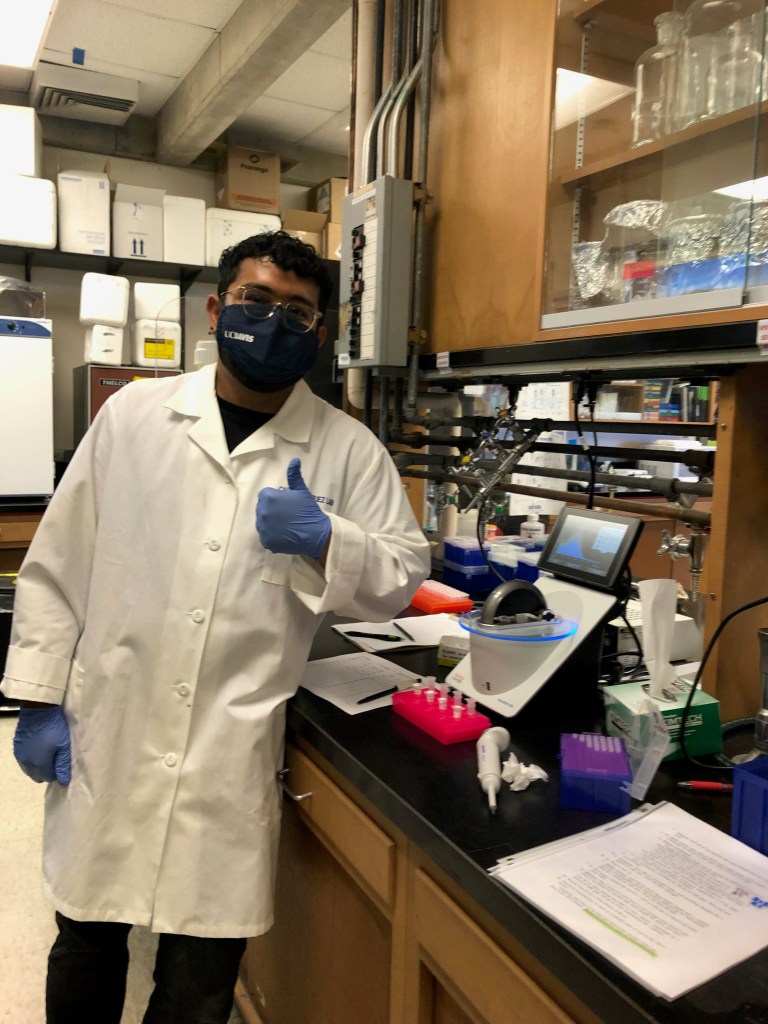 Jaime Morales Gallardo celebrates a successful day of genetic work in the lab. (Source: Victoria Farrar)