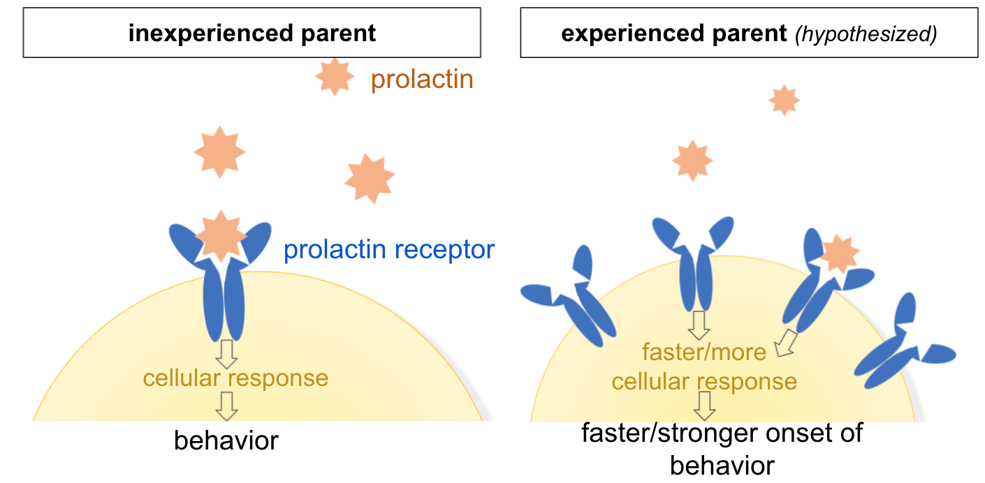 Hormones, like prolactin (shown in orange), float around the bloodstream to reach cells, where they have their effects by interacting with proteins called hormone receptors (here, the prolactin receptor is shown in blue). When this interaction occurs, the cell responds and physiology or behavior is affected. In the case of brain cells, or neurons, this leads to changes in behavior. I’m hypothesizing that experienced parents will have more receptors, making them more likely to respond strongly or quickly with key behaviors when taking care of young. (Source: Victoria Farrar)