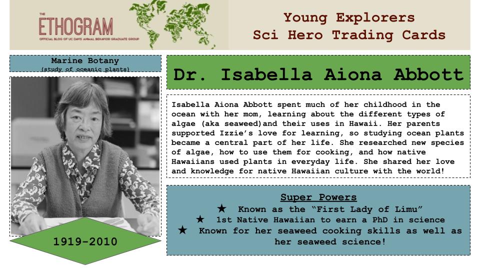 Check out The Ethogram’s Science Heroes column for more information about Dr. Aiona Abbott!