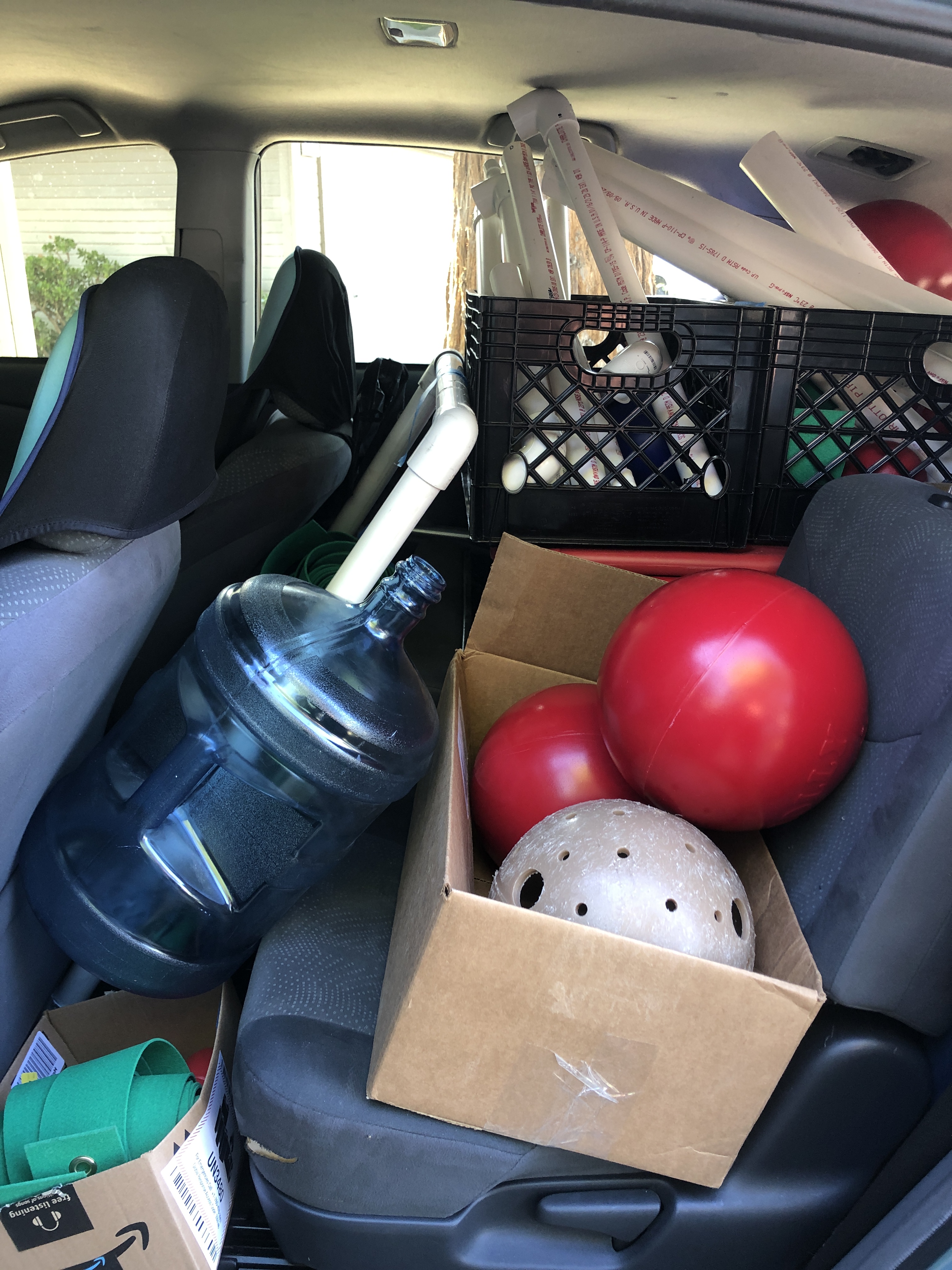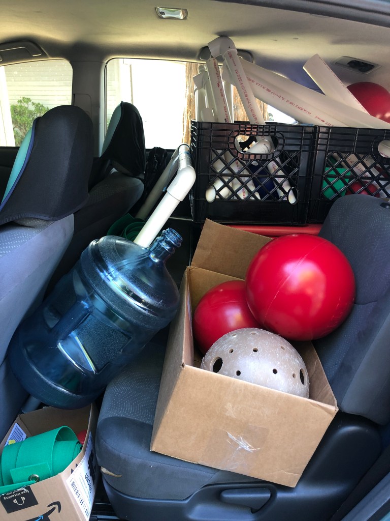 It is pretty amazing the amount of enrichment supplies “The Manatee” (the name of my trusty Prius) can hold! While all this equipment may not look anything like what a seal interacts with in the ocean, to quote Aristotle, “the whole is greater than the sum of its parts.” From PVC pipes to milk crates and car wash curtain strips, together these devices aim to improve a seal’s problem-solving behavior while they are in rehabilitation, while also being hygienic and safe for the animals to interact with.