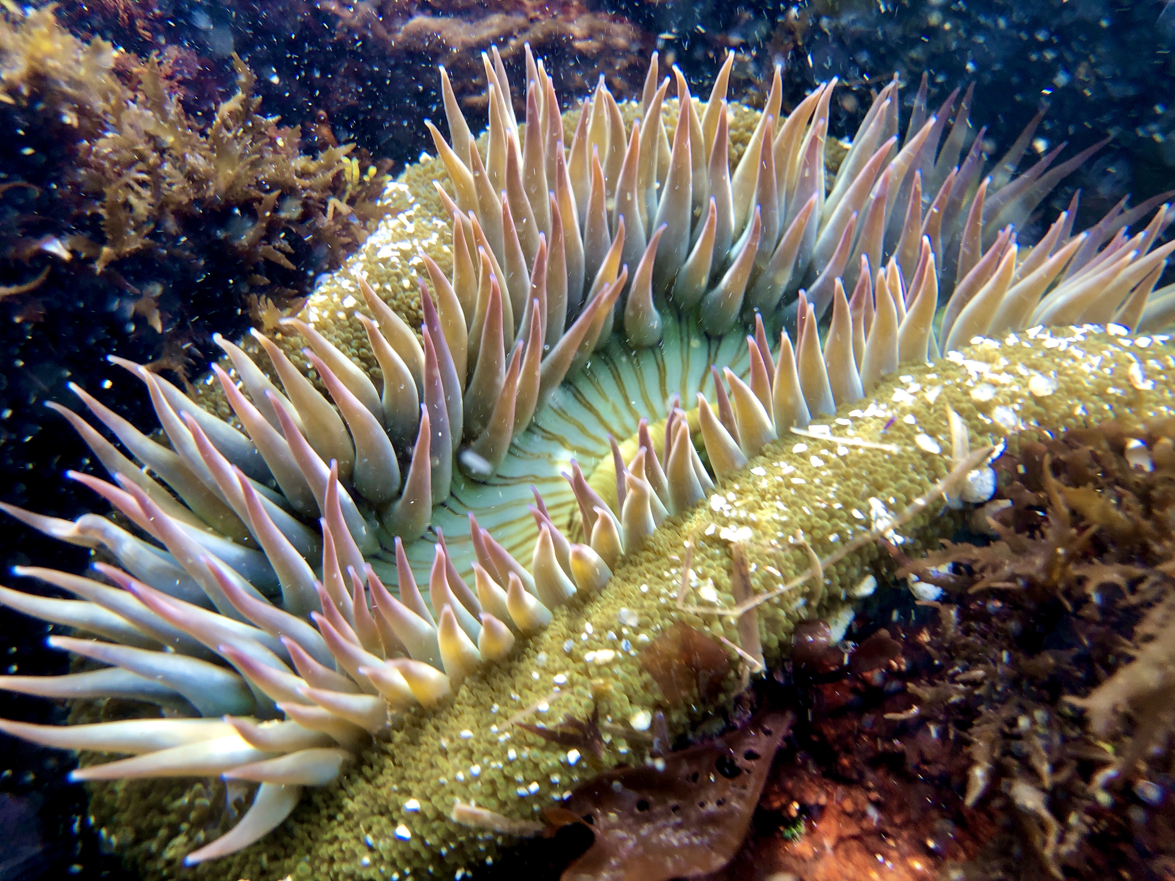 Ever been tidepooling and poked your finger in a squishy sea anemone just to see its petal-like arms grasp your finger? You may have noticed a somewhat sticky feeling as you shake those arms free, but how can something be sticky underwater? That sticky sensation you feel are actually nematocysts, which are microscopic stinging cells that sea anemones use as tiny harpoons to paralyze and capture prey. Even the biggest of sunburst anemones (Anthopleura sola), do not have nematocysts strong enough to have an effect on our human thick-skinned digits. However because nematocysts can only be used once and new ones must be re-grown, refrain from poking too much so that anemones don’t go hungry.