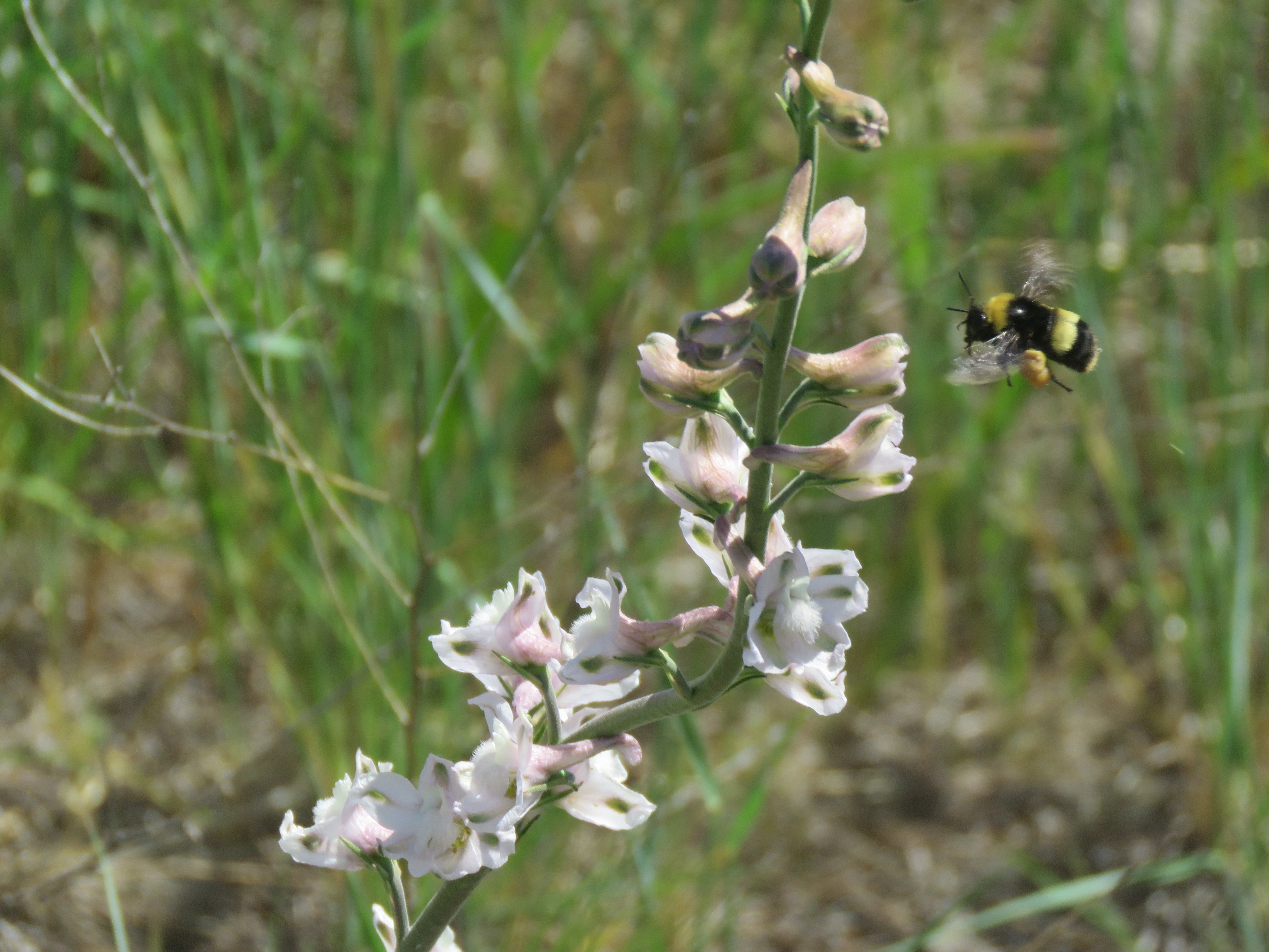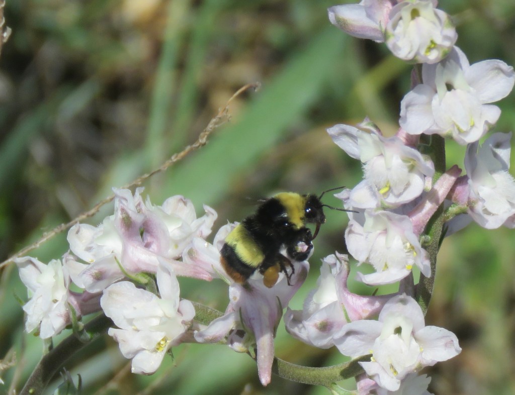 One day, I stood in a larkspur patch. Several Crotch’s bumblebees whirred between flowers. One bumblebee flew right up to my face and stared at me with large, black eyes. Did she think my bright pink shirt was a flower? Was she curious about my presence? She flew within a few inches of my nose and hovered there for a few seconds before landing on a larkspur blossom. Bumblebees are often particularly good at pollinating larkspurs and other species of flowers. They, along with other wild bees, provide $3251 per hectare in pollination services to crops [4].