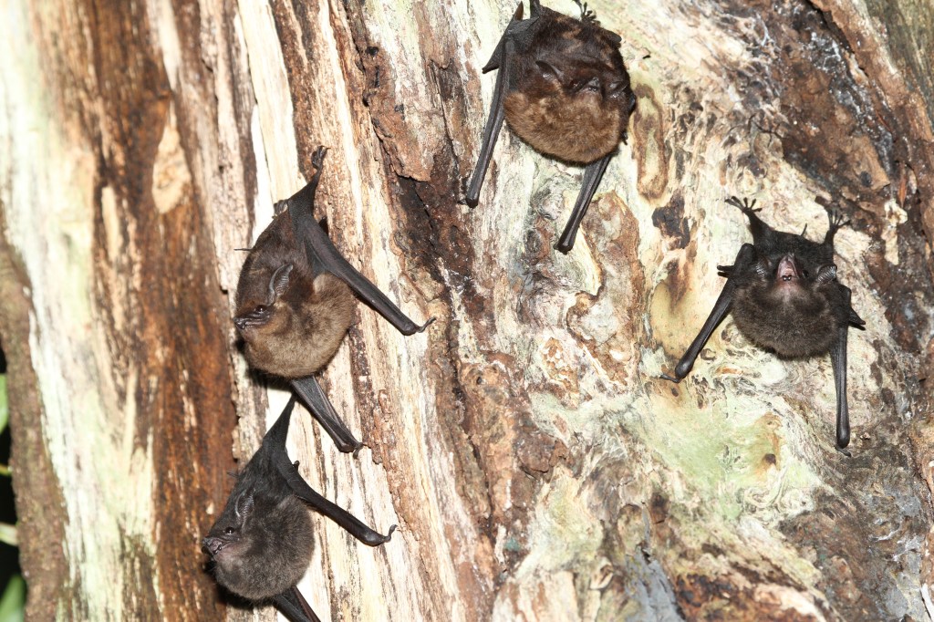 Imagine yourself on a walk through a Costa Rican rainforest at dawn. The sunlight starts to break through the canopy, all kinds of different bird species start their morning choruses, slowly awakening the other inhabitants of the jungle. Suddenly, there is another sound tuning in with all the different animal voices – it is a high-pitched chatter-like song descending from a large tree next to the trail you are walking on. But it does not exactly sound like a bird, does it? Following the sound, you discover a crevice on a large tree and find that the sound source is a small, brown furry ball, with two wavy, conspicuous white lines on the back, widely opening its mouth while singing from the bottom of its lungs, sitting next to other furry balls. Congratulations, you found a day roost of the Neotropical Greater Sac-winged bat, Saccopteryx bilineata!