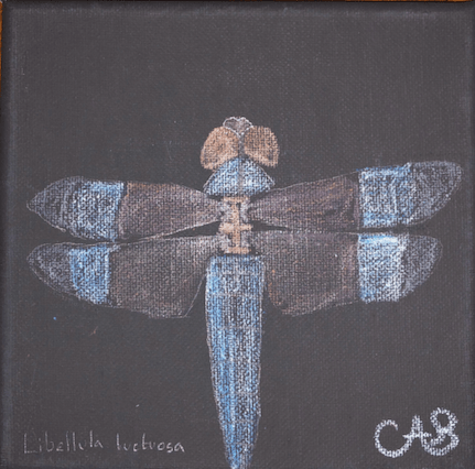 The widow skimmer, Libellula luctuosa, is a perching dragonfly commonly found across North America, including in California. Males are known for their distinct brown and blue wing coloration, but this pattern can be hard to see in the less colorful females. They hunt prey from a perch, darting off to grab if before returning to it with their meal. During the breeding season, males are territorial of their perch, and will chase off other males that get too close.