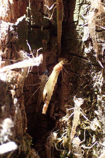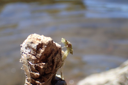 Most damselflies youโll probably see are in their flying adult stage, but they look much different as larvae. Damselfly larvae are called nymphs, and they are freshwater insects just like their dragonfly cousins. They cannot fly, and instead crawl around on their legs, as their wings are still developing in the โwing sheathsโ on their backs. The nymphs of damselflies are easy to distinguish from dragonflies, both due to their slender bodies and their external gills that hang off the back of their body. Damselflies often live in ponds or streams, and they are predators of small invertebrates in those ecosystems. Damselflies catch their prey by extending a labial mask towards their prey to grasp it and then pulling it to their jaws. This process of prey capture is shared with dragonfly nymphs; however, it was first studied and described in damselflies [3]. While Damselfly nymphs are successful predators, they are smaller on average than their dragonfly cousins, and so are preyed upon by fish and larger invertebrates, including dragonflies. When it comes time to emerge from the water and transform into an adult, damselflies often climb atop rocks or up vertical vegetation to prepare for metamorphosis [1].