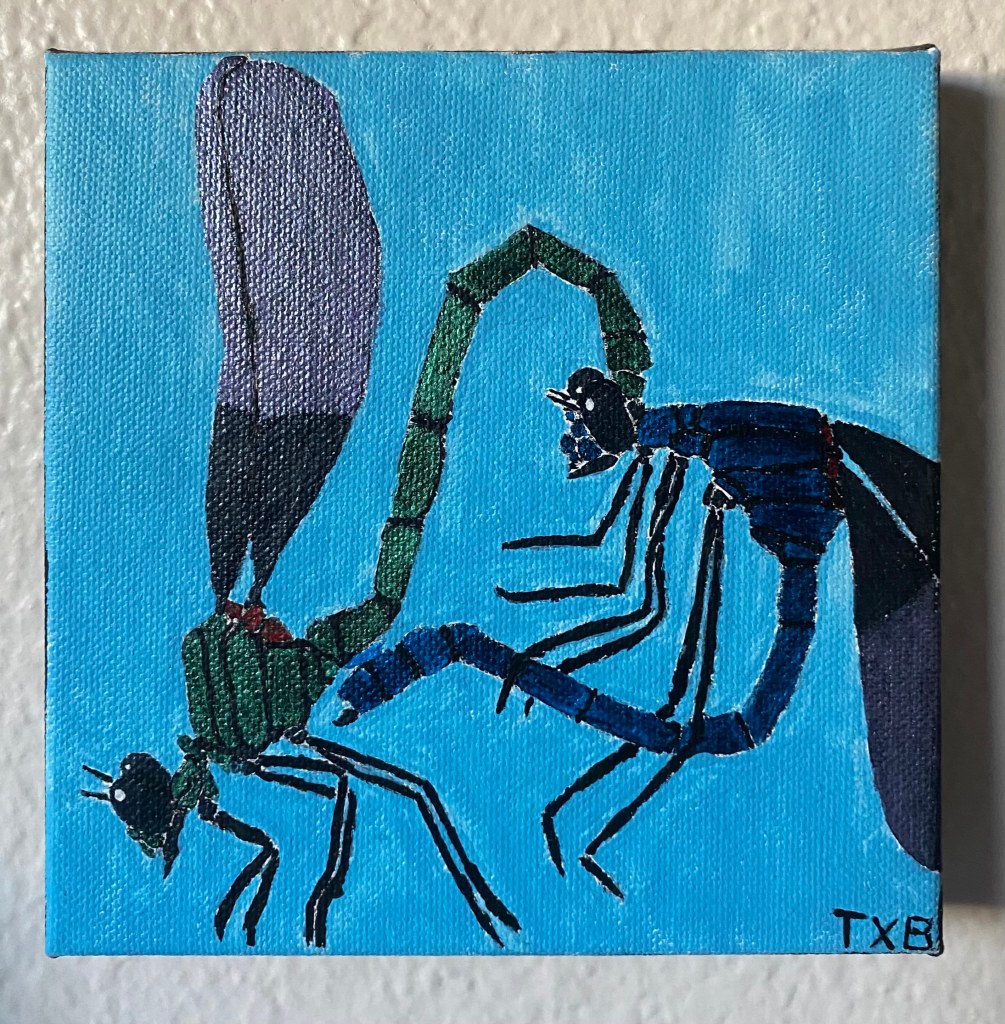 When mating, Damselflies enter a position called โthe wheel,โ in which the male grasps the female by the head and the female curls her body towards the male. This odd positioning is due to how the sex organs of damselflies are arranged, but also allows the male to guard the female when she deposits her eggs after mating. The more slender shape of their bodies results in a wheel shape that closely resembles a sideways heart, perhaps making damselflies the more romantic of the bugs in Odonata. When mating is complete, females deposit their eggs in aquatic plant matter or the water itself, often still connected in tandem with the male. Then, the eggs soon hatch and the cycle begins anew.