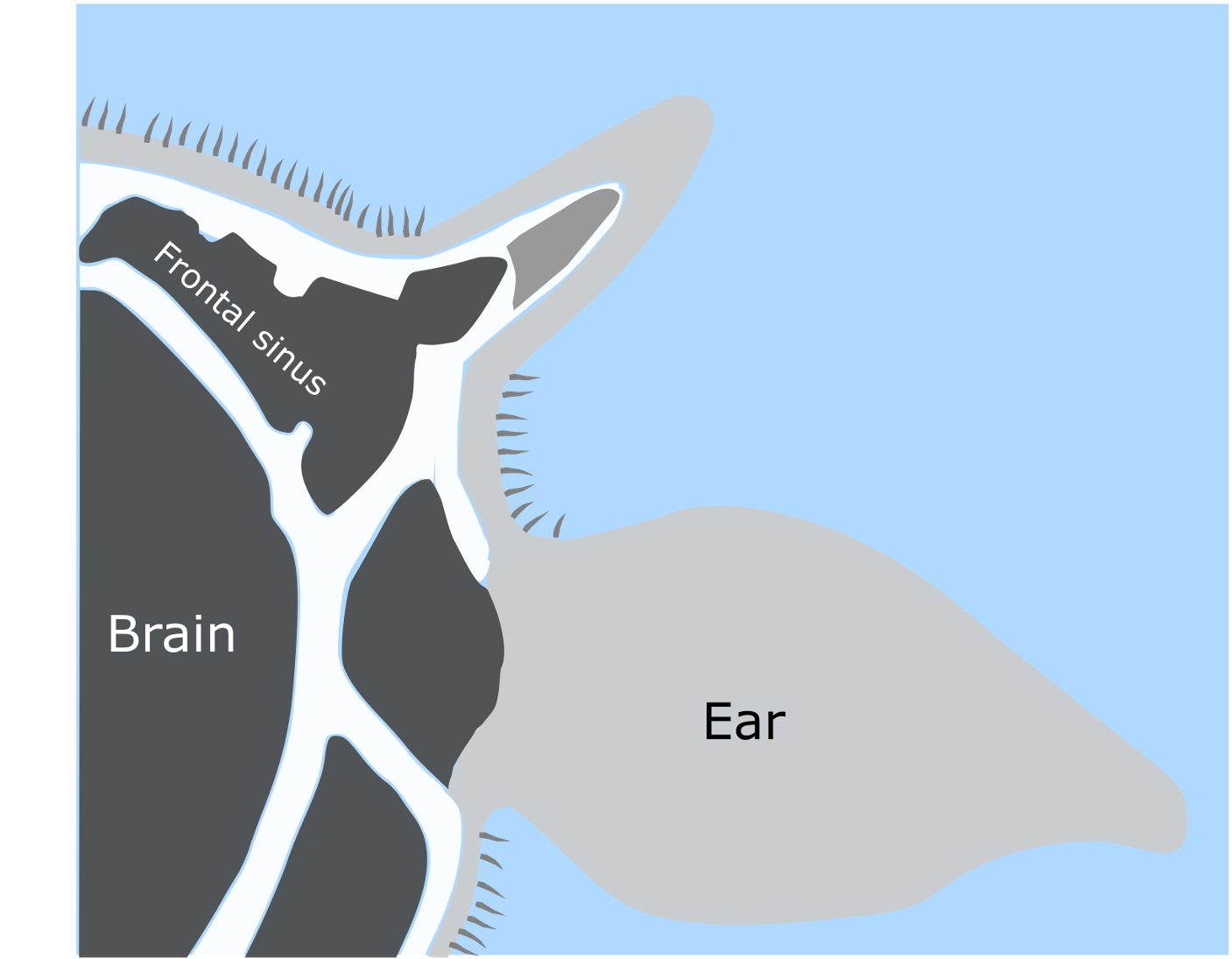 Horns are structures that grow on the heads of some animals, such as goats, cattle, big horn sheep, and buffalo. Horns should not be mistaken with antlers though, which are what grow on the heads of white tail deer. They are structurally different; antlers are made of solid bone, while horns are made of bone and keratin. Keratin is the same material that your fingernails are made of. For cattle, the formation of horns begins when the calf is developing. When a calf is born, it has small horn buds (about the size of pea) on top of their head, just above their ears. Around 8 weeks of age, cattle horns attach to their skull and grow from a small bump into more prominent horns. As cattle grow, their horns also increase in size. Interestingly, horns on cattle are not solid all the way through as you may imagine. Instead, horns have a hollow center that fills with part of their sinus cavity, blood vessels, and nerves as they age and continue to grow (see photo below). Among the cows that do grow horns, there can be a wide variety of shapes, sizes, and length of horns. The different appearance of horns can be influenced by the breed of cattle and their age.