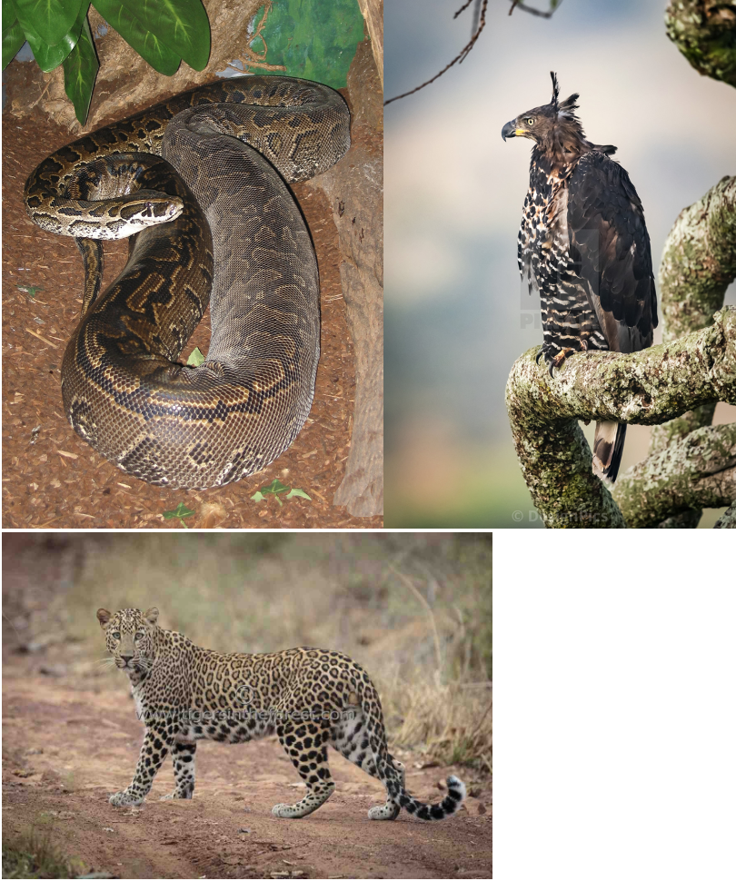 While mandrills are the predators of many species in the equatorial forests of Africa, they are also the prey of some of the primary predators in these regions as well. Their primary predator is known to be the leopard (Panthera pardus) [4]; however, reports of predation events by Crowned Eagles (Stephanoaetus coronatus) and African rock pythons (Python sebae) have been made for juvenile mandrills as well as old or sick mandrills. These reports put mandrills firmly in the center of the food chain in equatorial Africa.