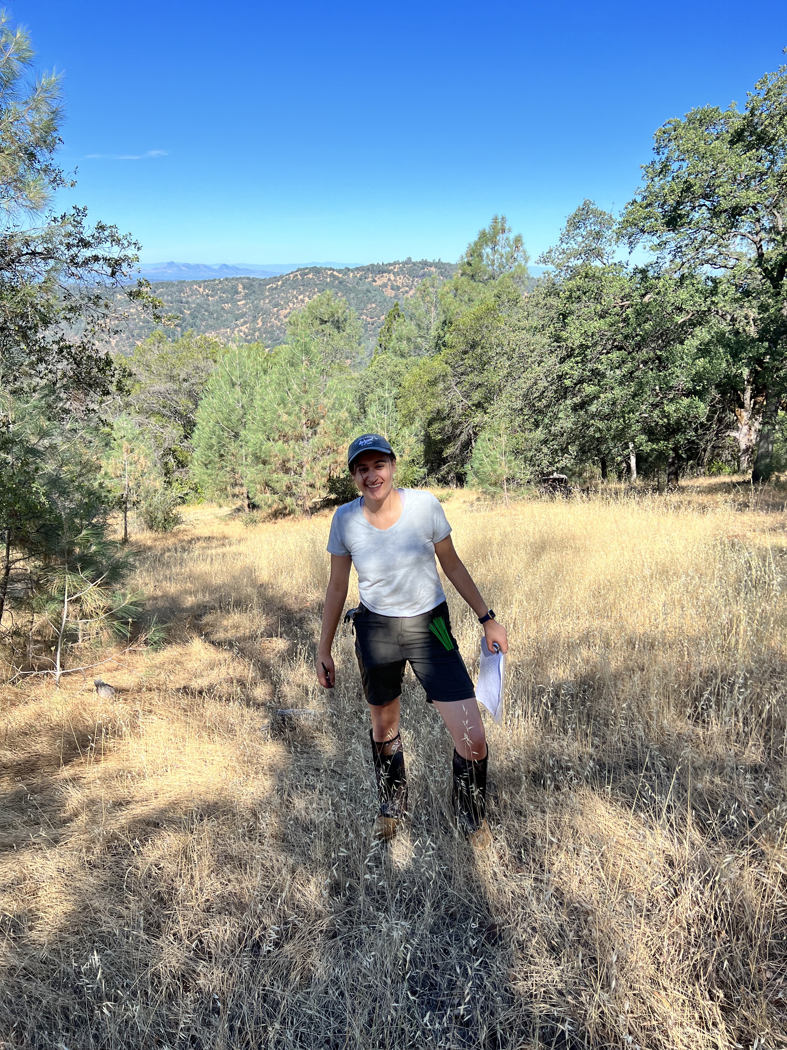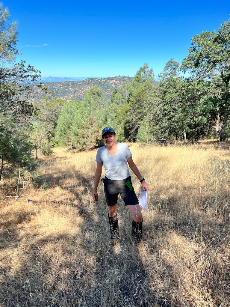 When I began working in the animal behavior and cognition lab at UCD under Dr. Tina Horback, I studied pig personality. I soon realized how applicable this kind of research would be to beef cattle production, a very California rangeland-relevant topic. Bringing the knowledge gaps located in cattle ID literature and rangeland magic together, I study consistent individual differences in cattle behavior in relevant management contexts and how they relate to grazing patterns on rangelands. To do this, I put adult female cattle individually through a short series of novel behavior and cognition assessments repeatedly across days, strap ‘em up with GPS collars, and send them out to graze over the summer. Adult female cattle are those that make up the ‘grazing herd’ that remains relatively stable over time, which is why I have chosen this population of cattle to study. Meanwhile, I also sample the type and amount of vegetation on the rangeland at timepoints pre and post-grazing to monitor cattle utilization and maintenance of native plant species. This is to determine if cows are grazing in the areas with dense, palatable, native plants or clumping in other areas of the range.
