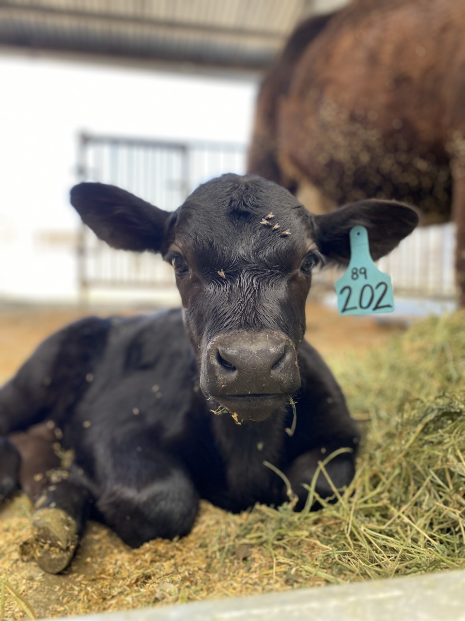 This beef calf, with her mom hanging out closely in the background, will stay with her for multiple months on pasture before she gets weaned. Weaning is the process where her mother will not allow her to drink milk from her teats any more. This naturally happens around 6 months of age!