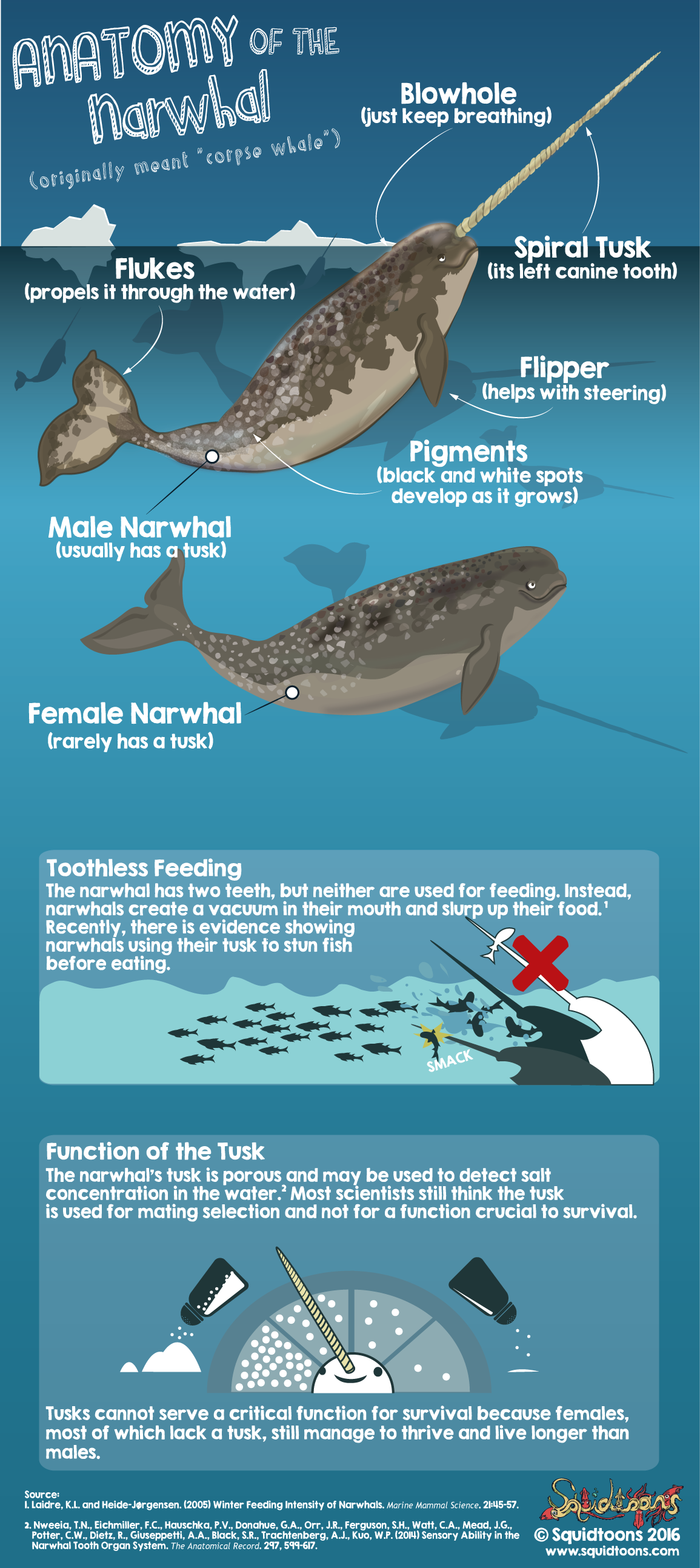 Did you know that narwhals have two teeth, but neither are used for feeding?! Instead, they eat by slurping their food through their mouth. Recent studies showed that they may use their long spiral tusks to stun their food before eating it.