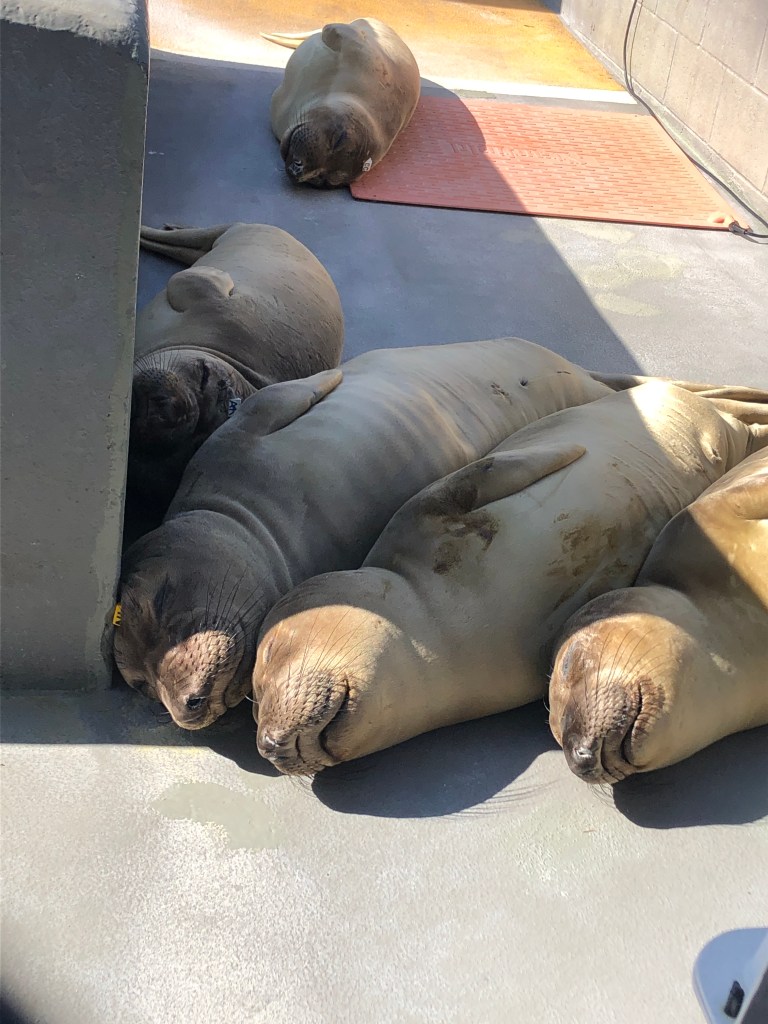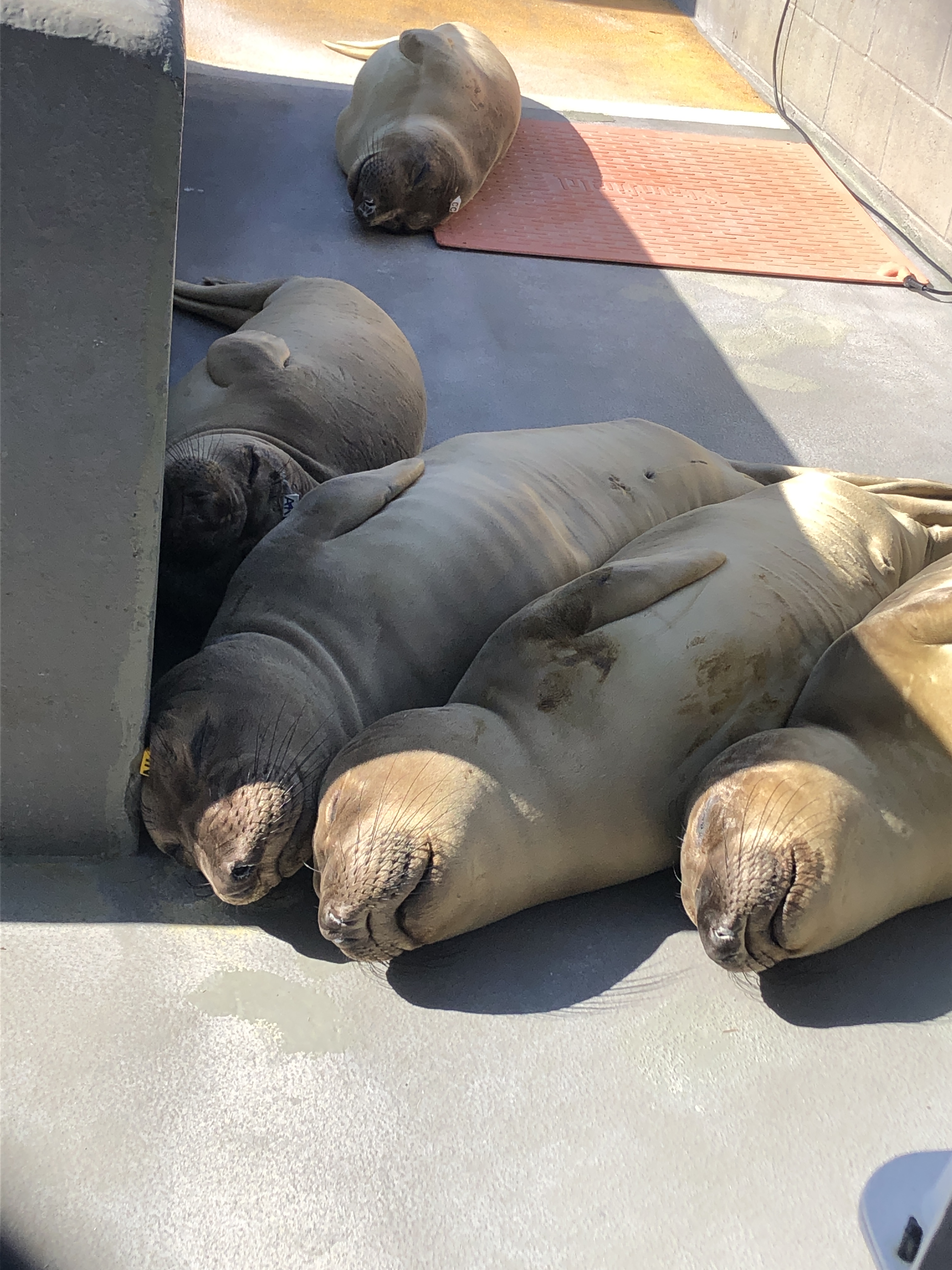 Any kind of data collection schedule is time-consuming and tiring, however, because field seasons only come around every (you guessed it) season, additional pressure mounts since the time we have with our study species is fleeting. This results in a period where we eat, live, and breathe our research, finding few brain cells to focus on anything but getting. that. data. There is the possibility of having multiple field seasons within a PhD journey, however, for many of us, COVID threw off that groove in a major way. For example, I passed my QE (a.k.a. qualifying exam, a long, difficult oral exam that “qualifies” us as PhD candidates) in January 2020, because I wanted to begin collecting data in March, when harbor seal pups and elephant seal weanlings are more likely to be rescued and in need of rehabilitation and care. Datasheets were printed, enrichment devices were built, and momentum for the field season to begin screeched to a halt and the world shut down. Seals were still being rehabilitated but for health and safety, visitors and researchers outside The Marine Mammal Center volunteers and staff were unable to be on hospital grounds. Even in 2021, I had a limited field season because harbor seals and elephant seals are rehabilitated in separate areas by separate volunteer crews and thus I was quarantined to one part of the hospital, only able to collect data on harbor seals.
