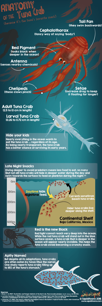 Tuna crabs (aka the pelagic red crab) live in the Pacific Ocean, and are named as such because they are the tuna fishes’ favorite snack to eat! Many tuna crabs live deep in the ocean to avoid predators, and baby tuna crabs are translucent, also aiding in their avoidance of animals who want to eat them.