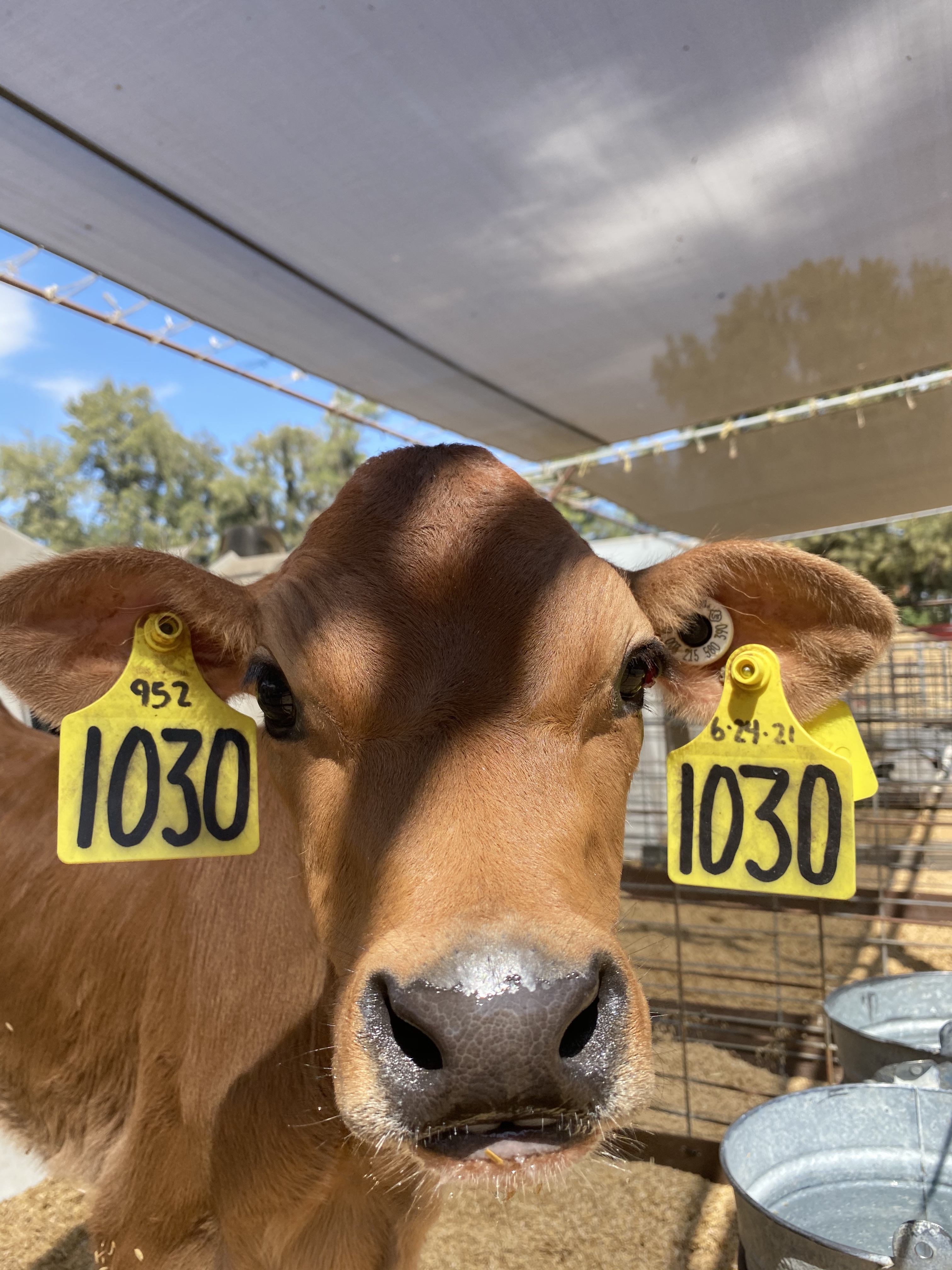 Jersey dairy calves (like the cutie seen here) are smaller than their Holstein counterparts, which are the black and white spotted dairy cows. Jerseys typically weigh around 60 pounds (27kg), compared to Holstein calves who can be born at over 100 lbs (45kg)! These are the two most common breeds of dairy cows in the United States, with an assortment of other breeds used in countries across the world.