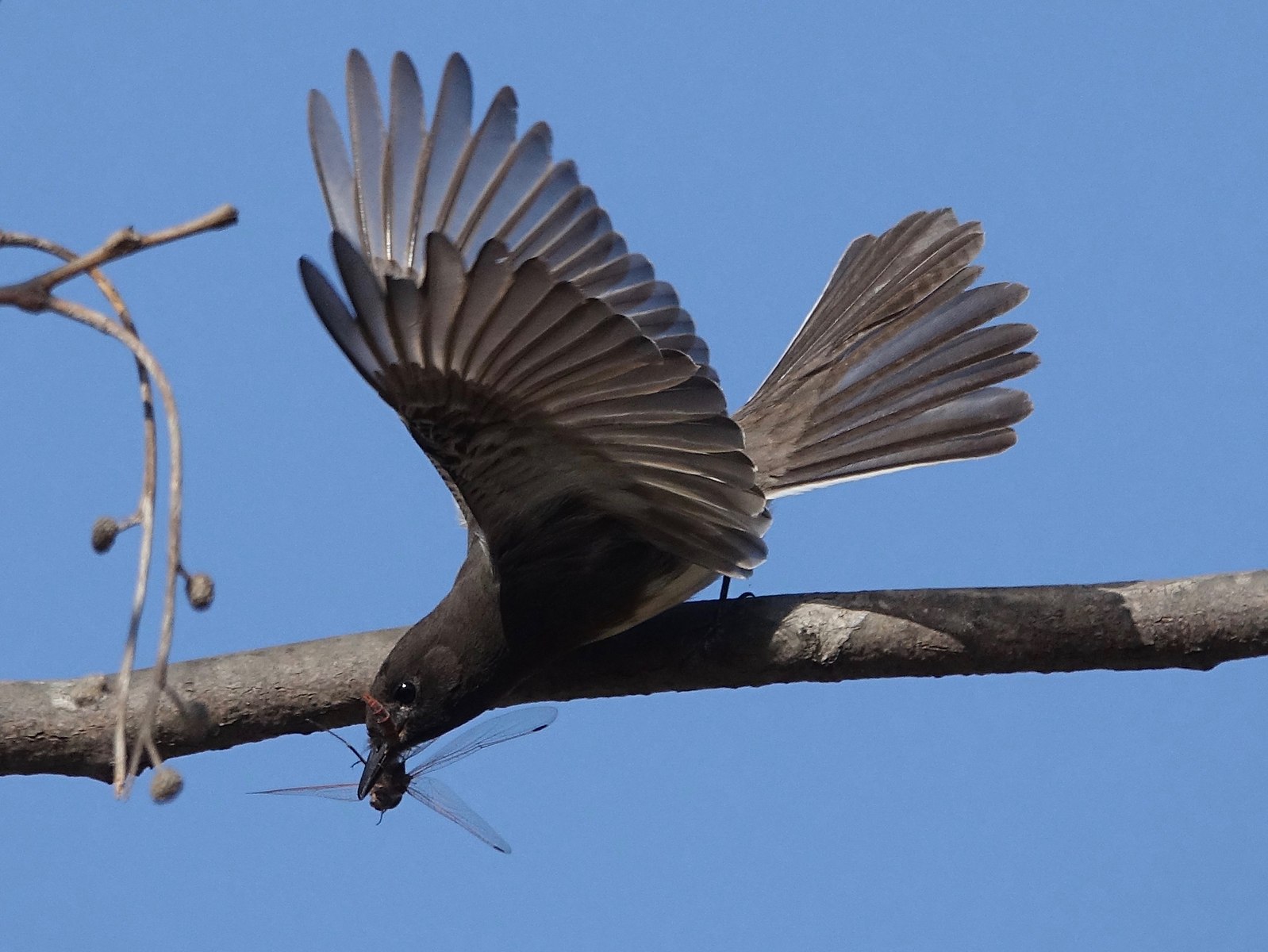 [1] Wolf, Blair O. (1997). Black Phoebe (Sayornis nigricans), version 2.0. In The Birds of North America (P. G. Rodewald, editor). Cornell Lab of Ornithology, Ithaca, New York, USA