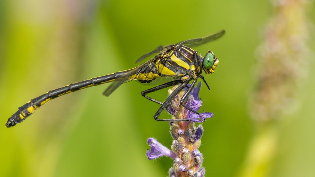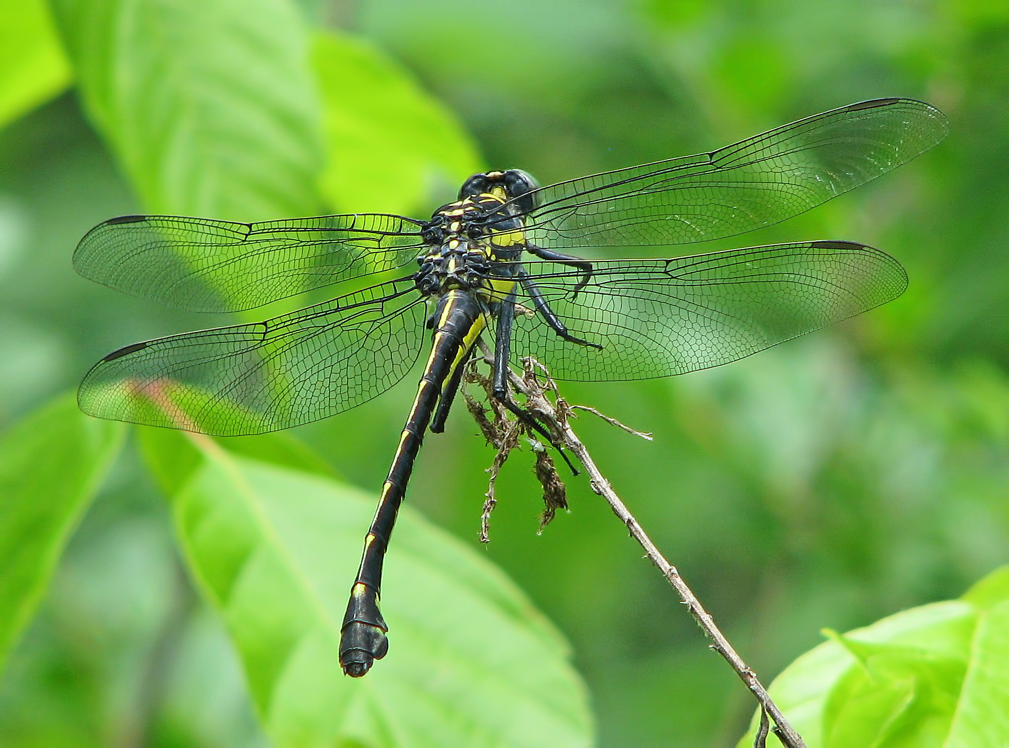 The dragonhunter, Hagenius brevistylus, is one of the largest species of dragonflies in North America, reaching up to 90 millimeters (or 3 ½ inches) in length [1]. It is in a group of dragonflies called the clubtails (family Gomphidae), named after the club-like shape at the end of the abdomen. As with most clubtails, these green and black striped dragonflies have eyes that do not touch at the top of the head, unlike those of other dragonfly groups. Adult male dragonhunters can be recognized by the slight downward “J” shape of their abdomen, which is more pronounced while in flight [1].